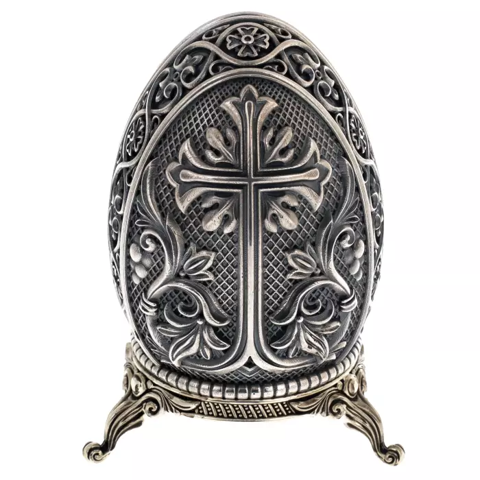 Пасхальное яйцо из серебра «ХВ» — изысканный символ одного из главных христианских праздников, выполненный в благородной и сдержанной манере, соответствующей его духовному смыслу. Форма яйца, издавна связанная с идеей возрождения и новой жизни, здесь раскрывается через ювелирную трактовку: строгий силуэт, подчеркнутый ажурным орнаментом и тонкой фактурой металла. Центральное место занимает монограмма «ХВ» — традиционное пасхальное приветствие «Христос Воскресе», выделенное теплым золотистым оттенком на фоне благородного серебра.