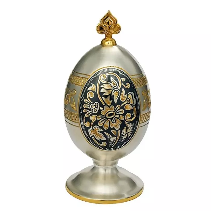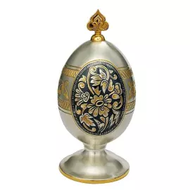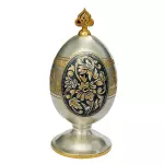 Нижняя часть яйца отделана изящной сеткой из позолоченного металла, имитирующей тончайшее плетение в технике филиграни. Этот декоративный приём придаёт визуальную лёгкость объёму и подчёркивает архитектурную строгость формы. Изделие покоится на ажурной трёхлучевой подставке с ножками в виде изогнутых завитков, напоминающих грифоны в старинных орнаментах. Витиеватость силуэта уравновешивается симметрией и точной геометрией основания, что создаёт ощущение драгоценного артефакта, созданного не столько для практического использования, сколько для эстетического созерцания.