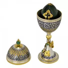 Нижняя часть яйца отделана изящной сеткой из позолоченного металла, имитирующей тончайшее плетение в технике филиграни. Этот декоративный приём придаёт визуальную лёгкость объёму и подчёркивает архитектурную строгость формы. Изделие покоится на ажурной трёхлучевой подставке с ножками в виде изогнутых завитков, напоминающих грифоны в старинных орнаментах. Витиеватость силуэта уравновешивается симметрией и точной геометрией основания, что создаёт ощущение драгоценного артефакта, созданного не столько для практического использования, сколько для эстетического созерцания.