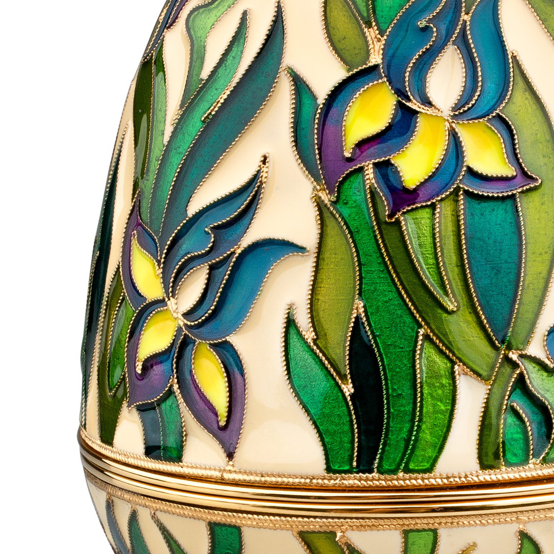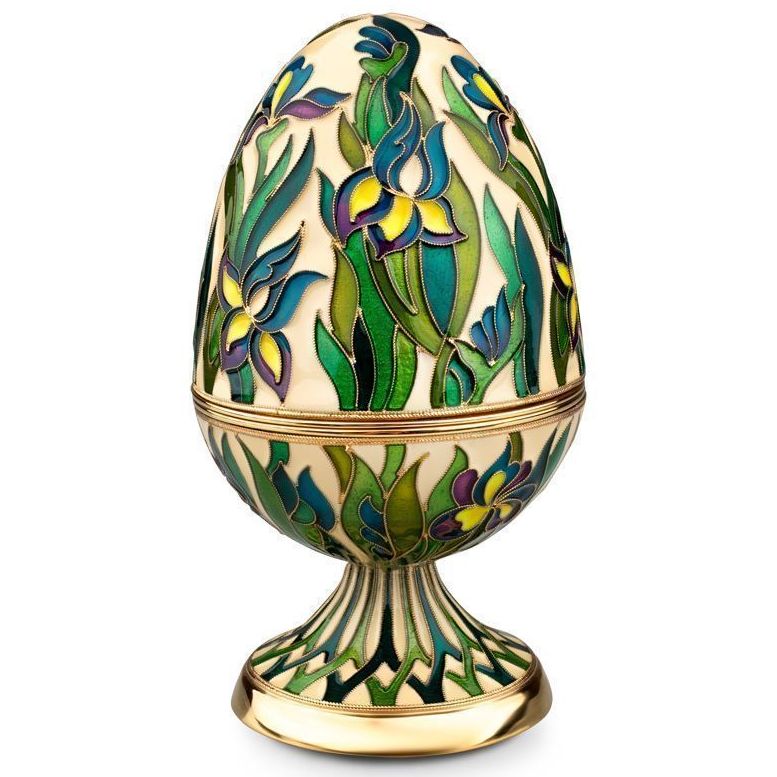 Сувенирное яйцо-шкатулка «Ирисы» — изысканный образец декоративного искусства, воплощающий весеннюю свежесть и утончённую чувственность в ювелирной форме. Корпус изделия выполнен из меди, закреплённой на литой подставке с зеркальной полировкой, создающей эффект лёгкости и изящества. Вся поверхность покрыта тончайшей перегородчатой эмалью, вручную выложенной в виде стилизованных ирисов, словно вырастающих на гладкой эмалевой почве. Цветы, окружённые лентами листвы и грациозных изгибов, охватывают яйцо, превращая его в живописную миниатюру.