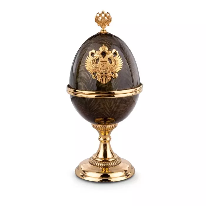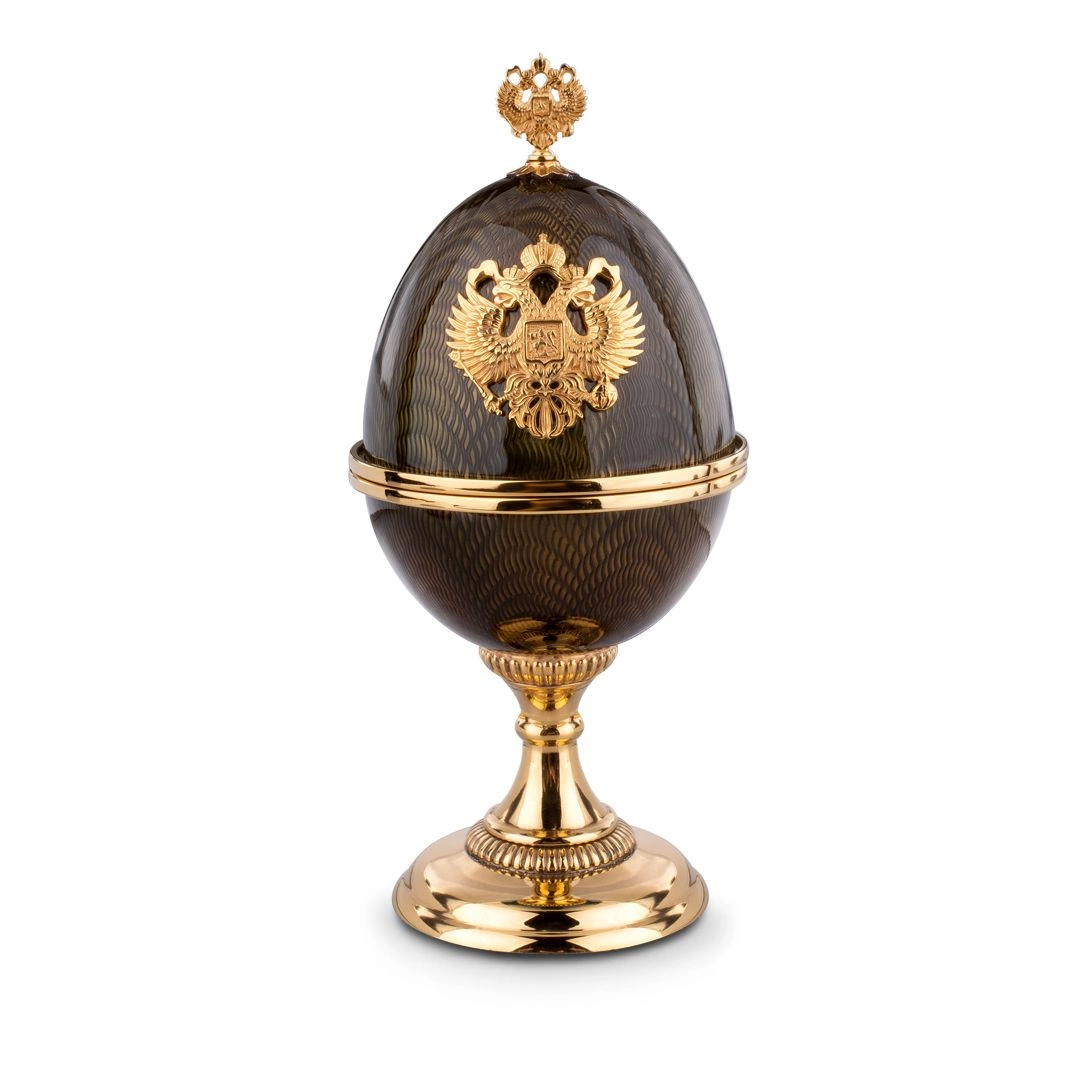 Яйцо-шкатулка — выразительный предмет интерьерного искусства, выполненный из металла с позолотой и покрытый гильошированной эмалью. Классическая форма дополнена декоративным рельефом в виде государственного герба, размещённого на лицевой стороне, что придаёт изделию особую торжественность и статусный характер.