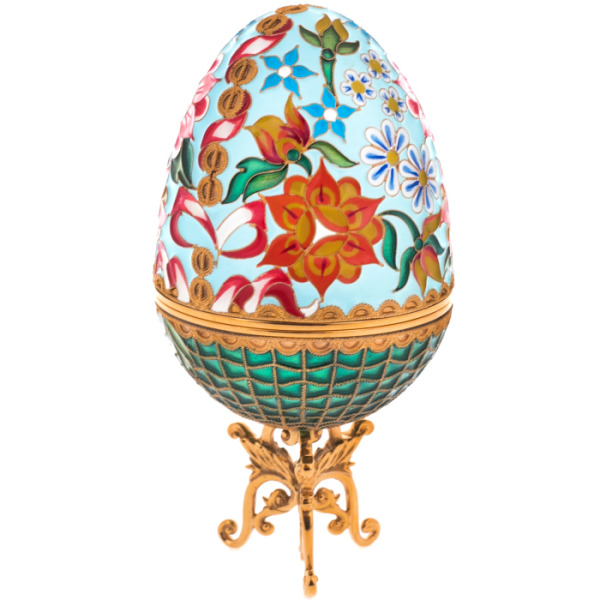 Нижняя часть яйца отделана изящной сеткой из позолоченного металла, имитирующей тончайшее плетение в технике филиграни. Этот декоративный приём придаёт визуальную лёгкость объёму и подчёркивает архитектурную строгость формы. Изделие покоится на ажурной трёхлучевой подставке с ножками в виде изогнутых завитков, напоминающих грифоны в старинных орнаментах. Витиеватость силуэта уравновешивается симметрией и точной геометрией основания, что создаёт ощущение драгоценного артефакта, созданного не столько для практического использования, сколько для эстетического созерцания.