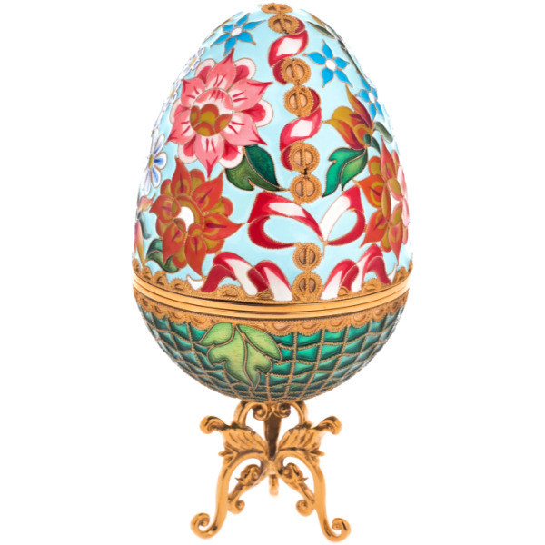 Особое внимание привлекает тончайшая филигрань на обратной стороне шкатулки — завитки и узоры образуют гармоничную симметрию, напоминая о цикличности жизни и красоте природы. Это больше, чем декор: это философия, заключённая в металле и цвете. Открывая яйцо, ощущаешь торжественность момента — внутреннее пространство изделия бережно выложено полированной золотистой поверхностью, сияющей, как утренний свет.
