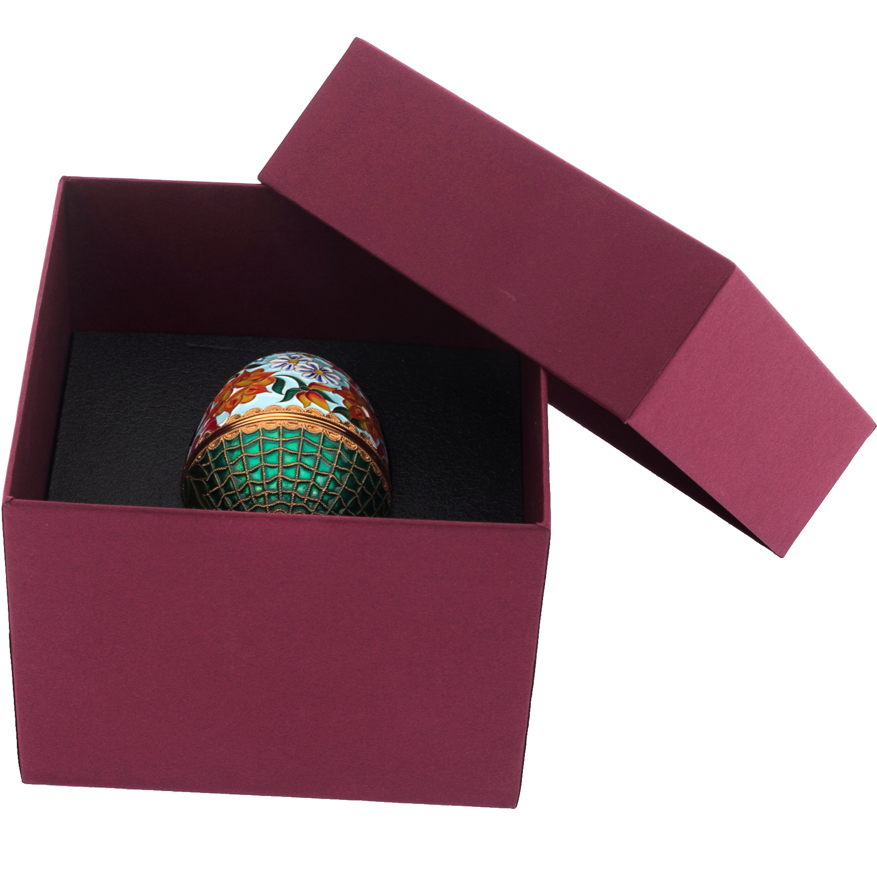 Яйцо-шкатулка «Лето» — это настоящее воспевание жизни и цвета, воплощённое в меди, эмали и золоте. Верхняя часть украшена буйным цветением: алые, лазурные, белоснежные и лавандовые цветы раскинулись на фоне летнего неба, создавая ощущение тёплого солнечного дня, застывшего в металле. Нижняя половина декорирована орнаментом в виде изумрудной решётки, придающей композиции архитектурную строгость. Изящная ножка с растительными завитками служит прочным основанием, поднимая композицию и придавая ей лёгкость. Внутри шкатулки — полированная чаша с благородным золотым блеском, подходящая для хранения украшений или особых мелочей.