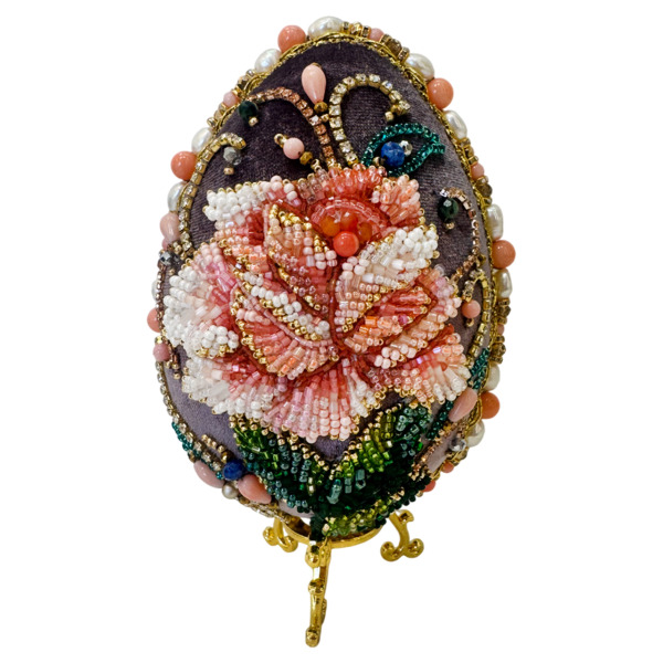 Яйцо вышитое драгоценными камнями "Роза" на подставке