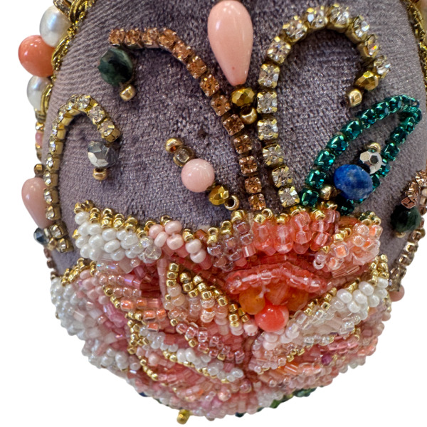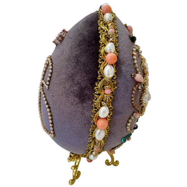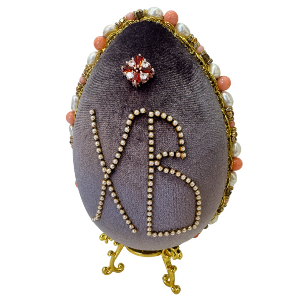 Вышитое яйцо "Роза" — редкий пример ювелирного текстиля, объединившего в себе каноны православной традиции и блеск драгоценных ремёсел. Бархат насыщенного цвета, служащий фоном композиции, придаёт изделию глубину и торжественность, а орнамент, выполненный в технике ручного шитья и бисероплетения, воспроизводит ветви жизни — символы обновления, света и воскресения.