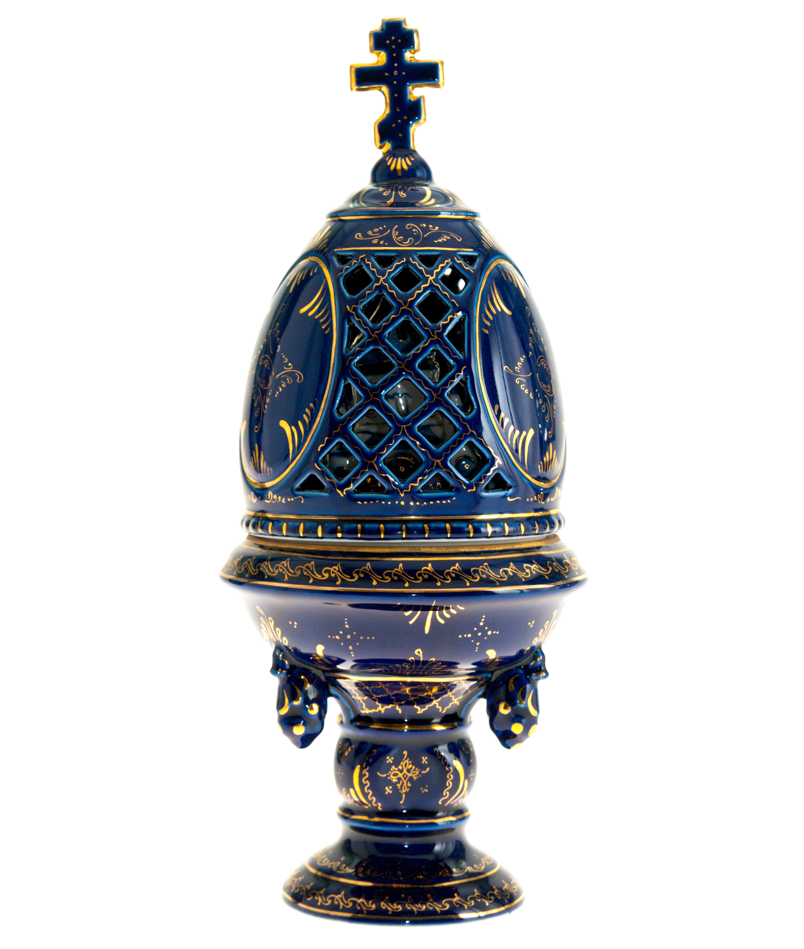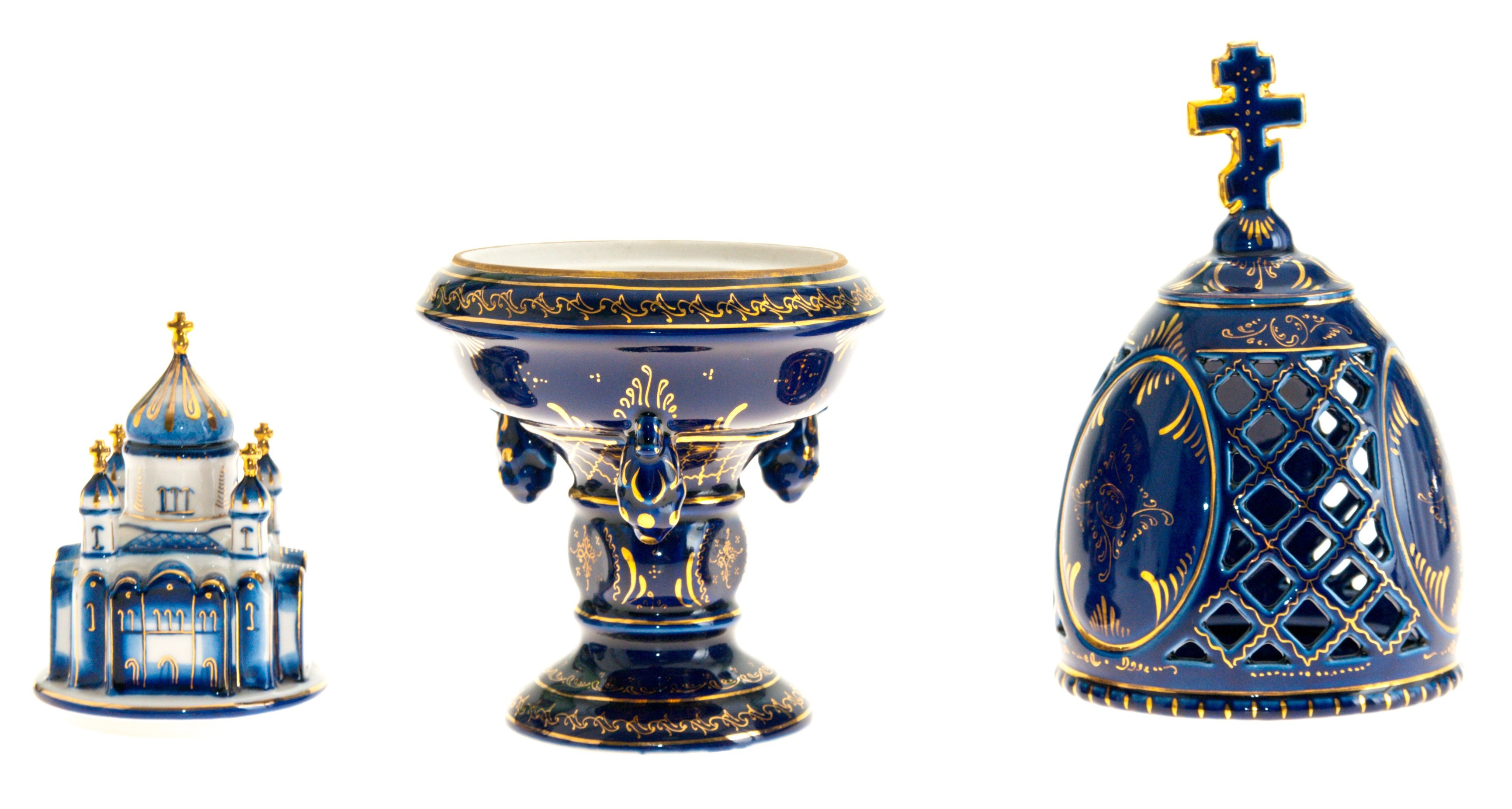 Материалы:фарфор, кобальтовая глазурь, надглазурные ручная роспись, золото.