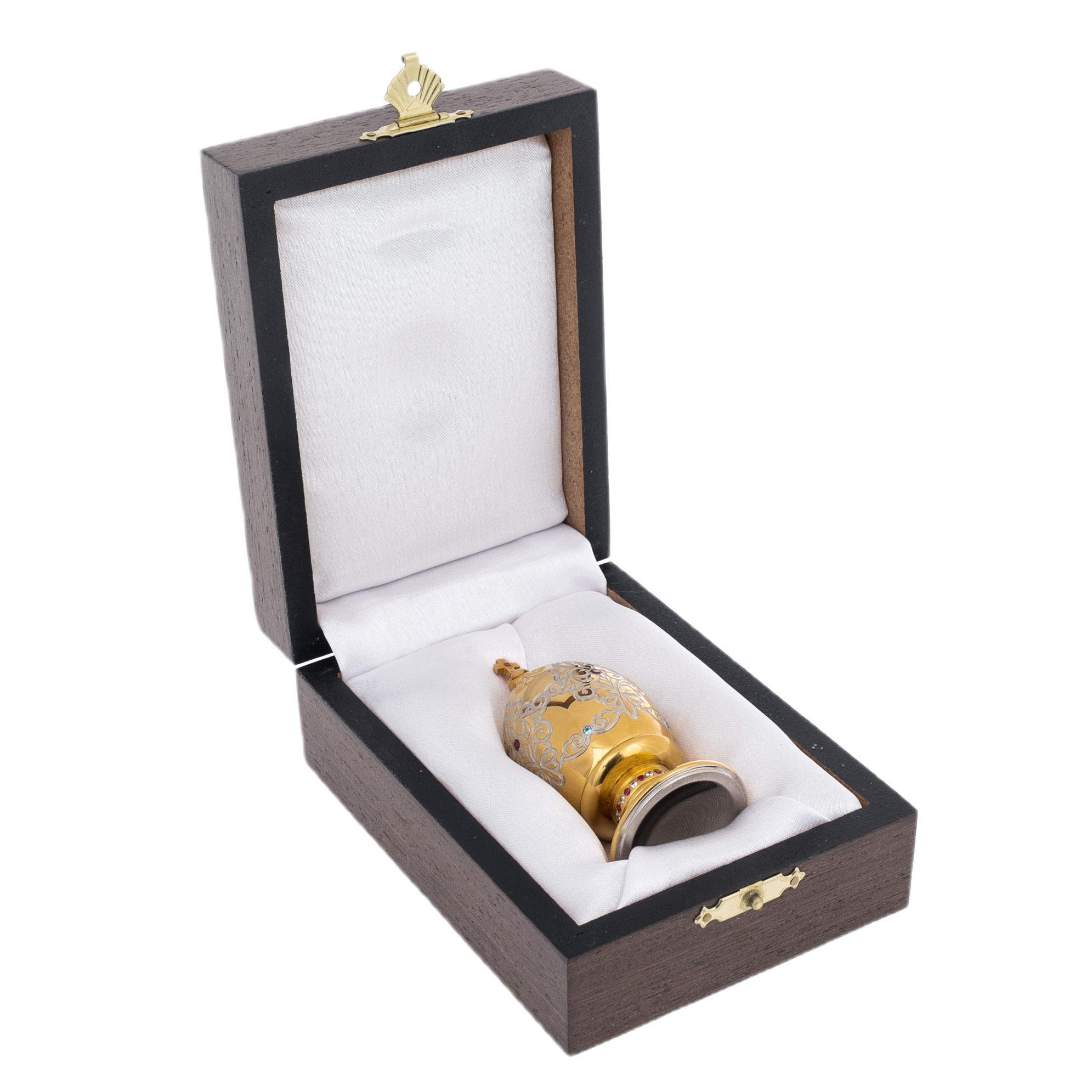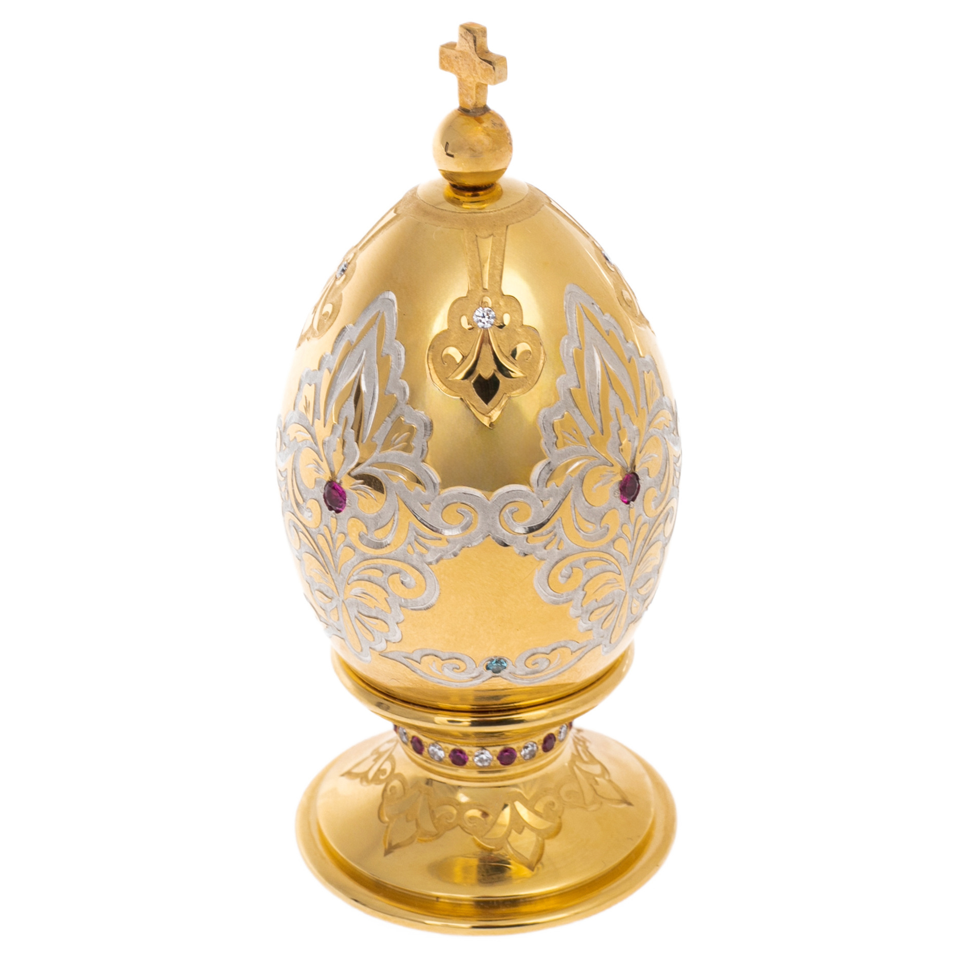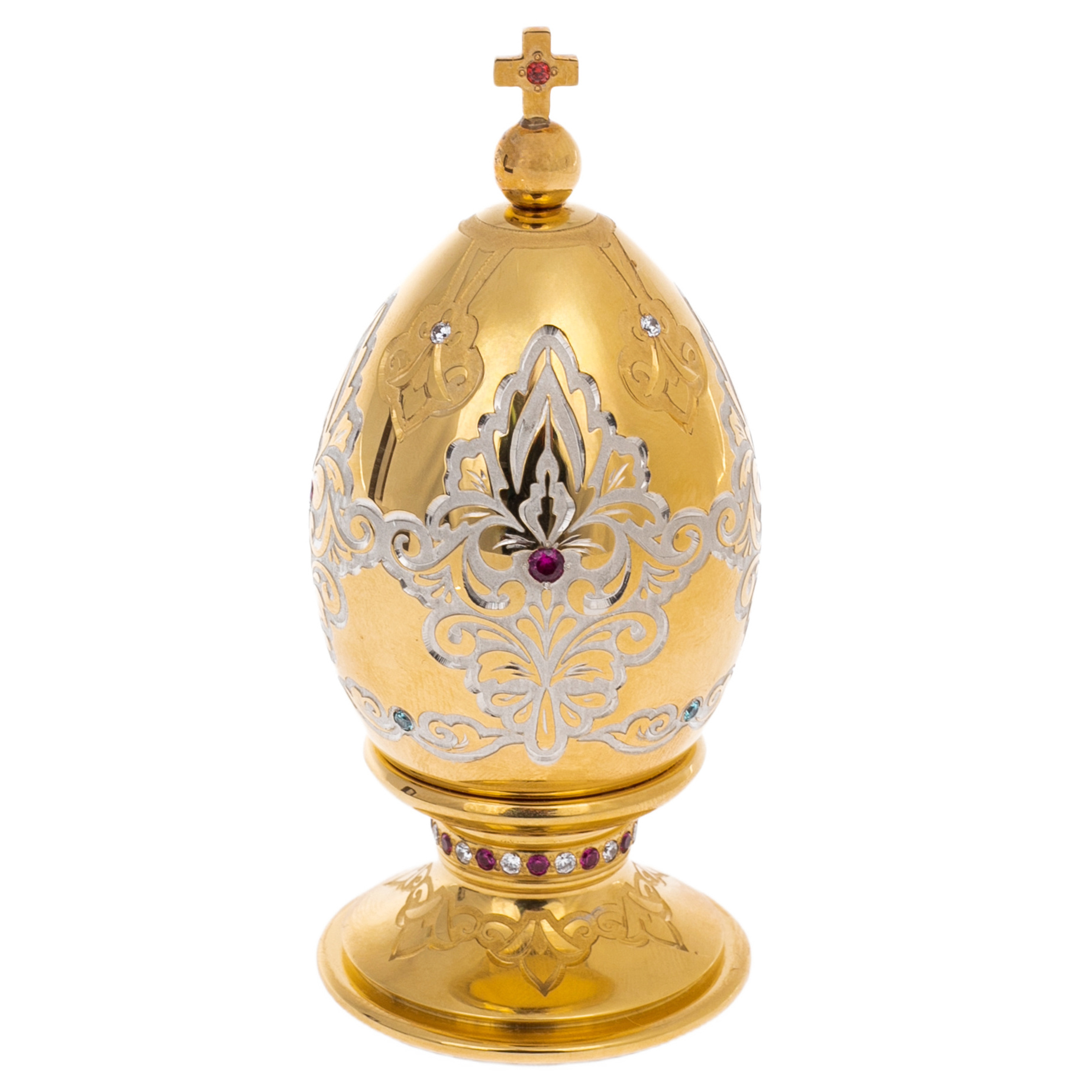 Пасхальное яйцо из Златоуста — редкий образец ювелирного искусства, в котором сакральный символ обретает форму безупречного арт-объекта. Массивное яйцо из латуни покрыто глянцевым золотым слоем и украшено изысканным серебряным орнаментом в виде стилизованных растительных завитков. Декор усилен сверкающими вставками из разноцветных кристаллов: красных, голубых и прозрачных. В верхней части — крест, возвышающийся на сферическом навершии, символизирующий духовное начало. Основание — широкое и устойчивое, также декорировано гравировкой и рядом сверкающих камней, оттеняющих основное сияние композиции. Этот предмет предназначен для тех, кто ценит православную традицию и желает подчеркнуть свою приверженность высоким культурным и эстетическим ценностям.