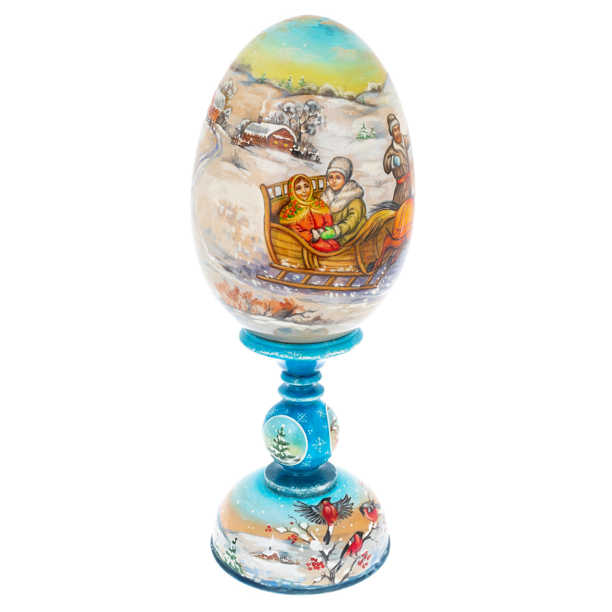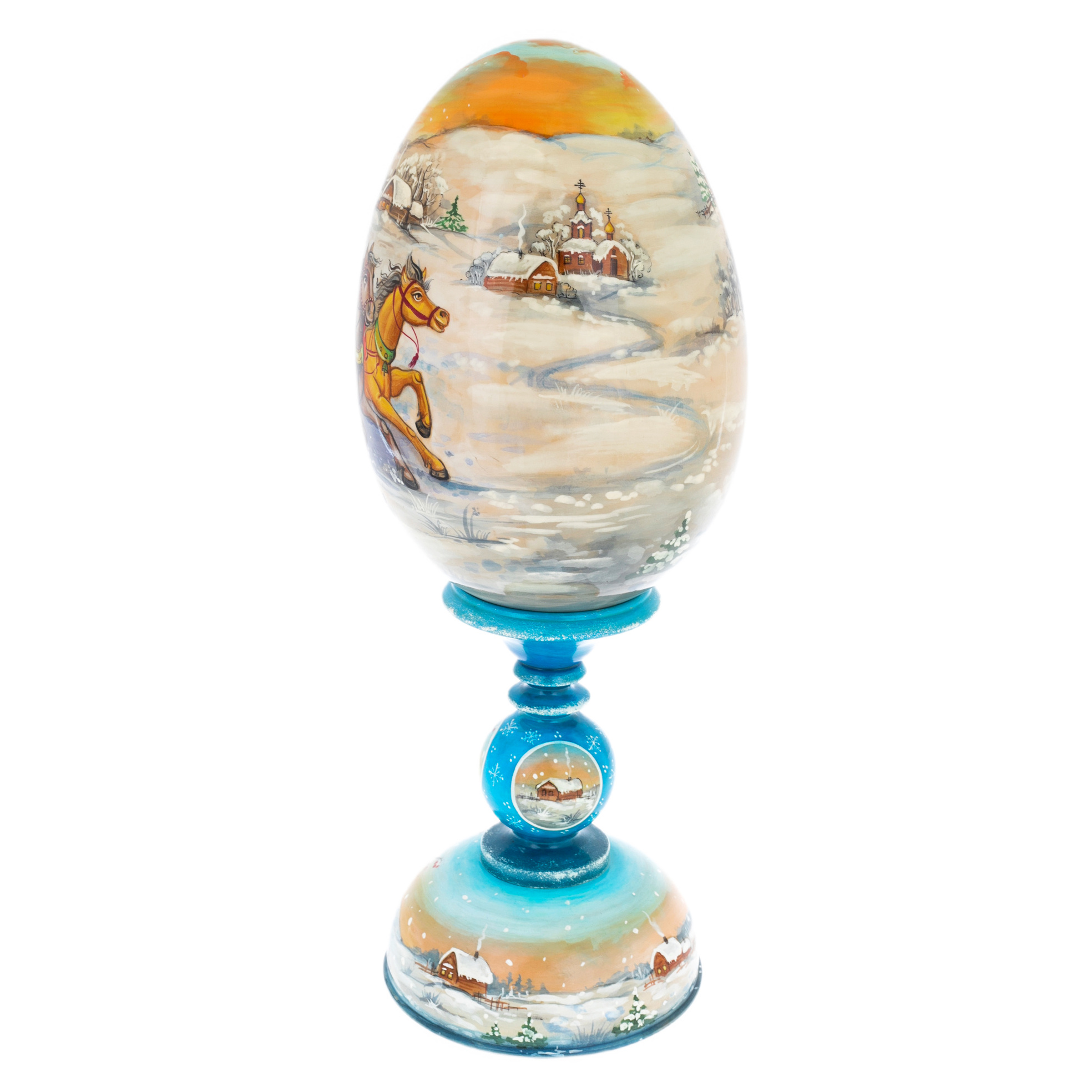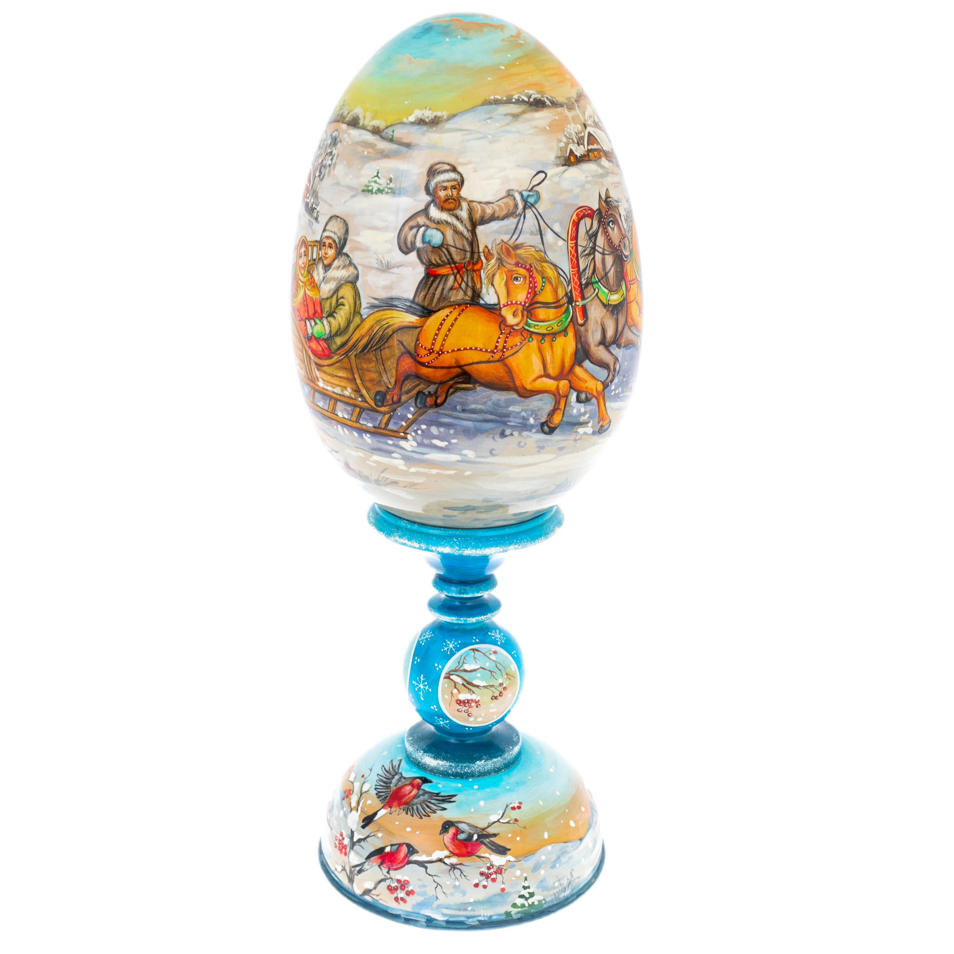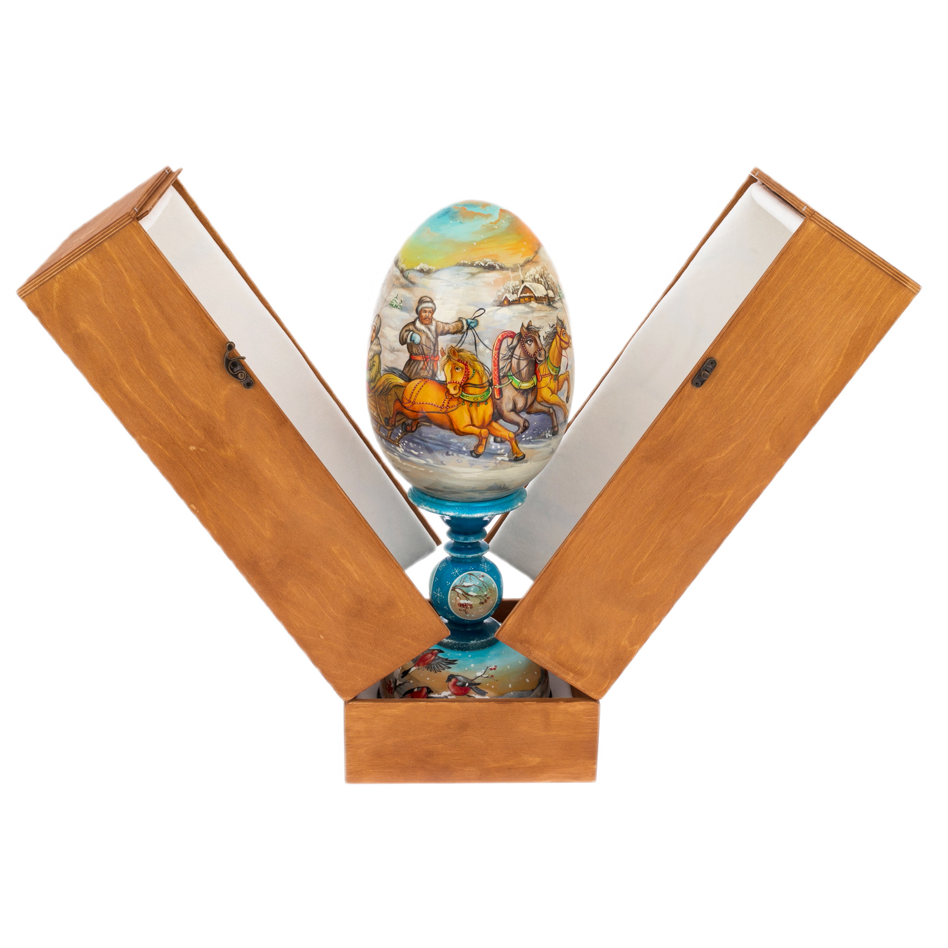 Мастерски выполненное авторское яйцо "Зима" вносит в интерьер тихую радость русской зимы, той, что помнится по старым открыткам, ароматам хвои и теплому свитеру. В миниатюрной сцене на корпусе – заснеженные деревни, тройка лошадей в яркой сбруе, весело мчащаяся по искрящемуся снегу, и лица пассажиров, озарённые счастьем и свежестью мороза. Движение запечатлено с кинематографической точностью, каждый мазок на корпусе несёт в себе живую динамику, каждое облачко пара дышит подлинностью. Сюжет переходит с одного ракурса в другой, раскрывая перед зрителем целую галерею зимней жизни — от ярмарок до церквей с золотыми куполами на фоне закатного неба.