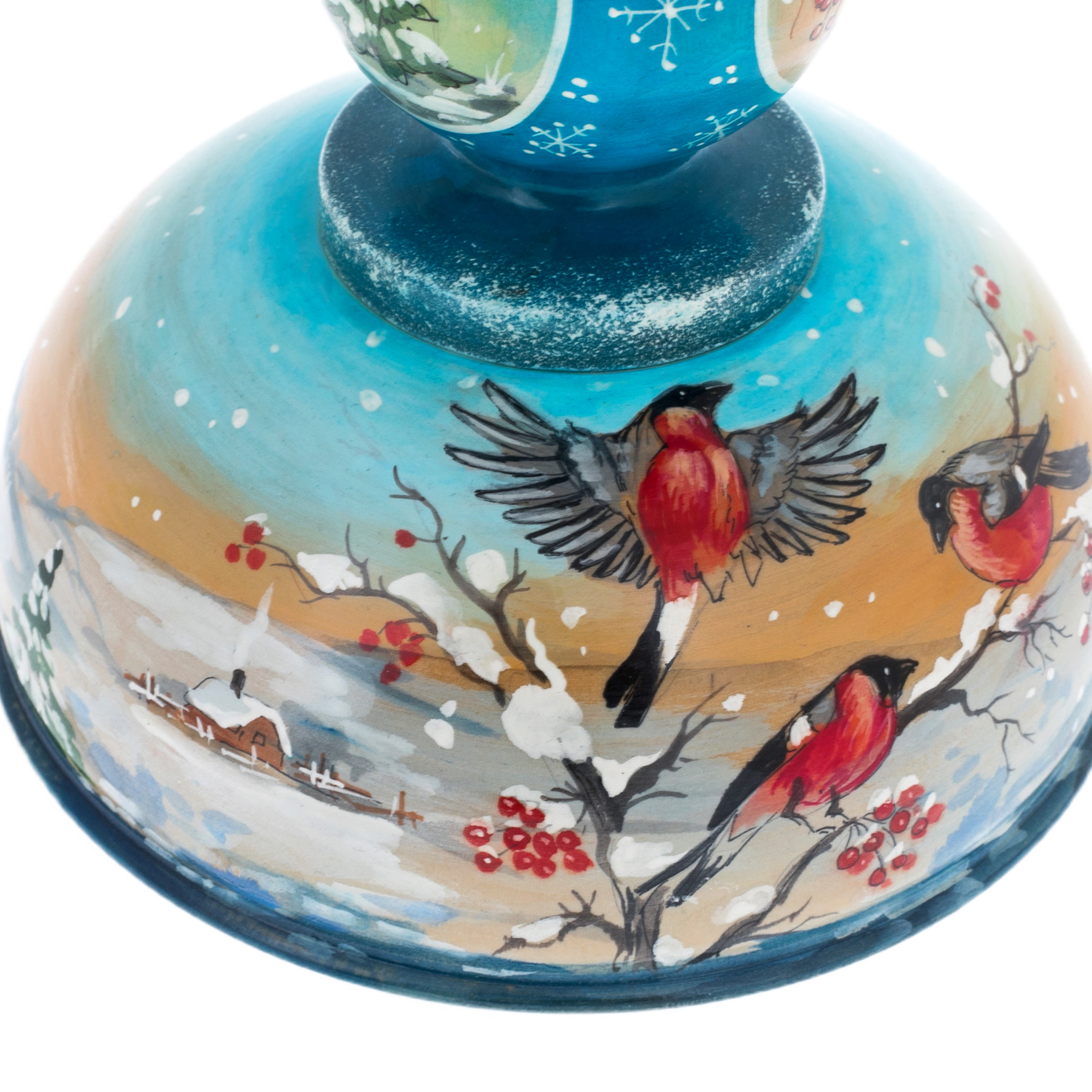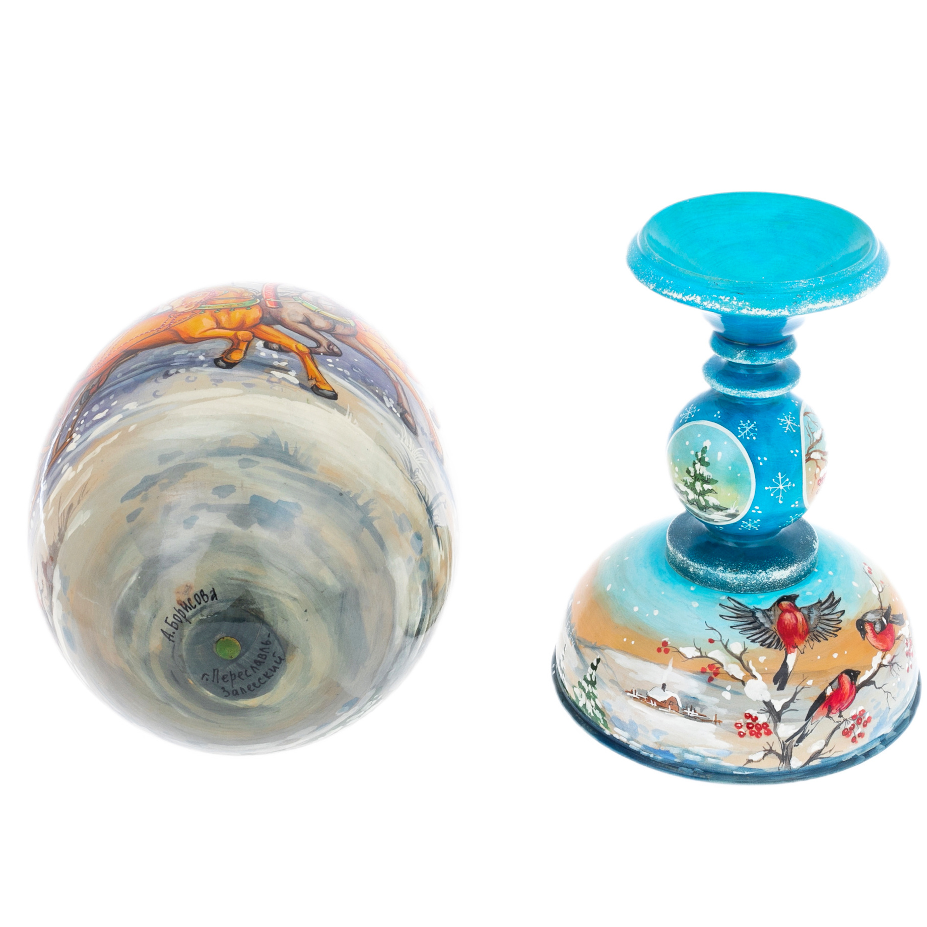 Подставка, окрашенная в насыщенные лазурные тона, украшена рукописными миниатюрами с образами снегирей, ветвей с алыми ягодами и тихими заснеженными домами, будто бы стоящими на стыке вечера и волшебства. Поверхность покрыта тонким глянцем, усиливающим сияние красок. Каждый элемент композиции написан вручную, с авторскими стилем и мастерством, не оставляющими сомнений в уровне художественного исполнения. Композиционная завершённость и баланс форм создают не просто предмет, а музейный экспонат, вписывающийся в пространство ценителя как знак безупречного вкуса.