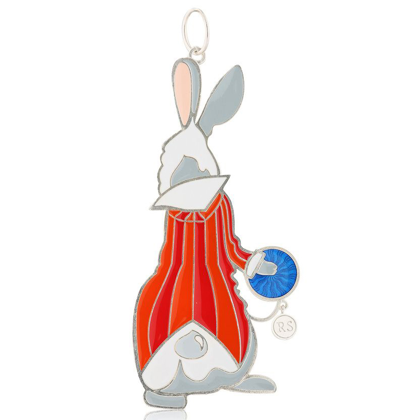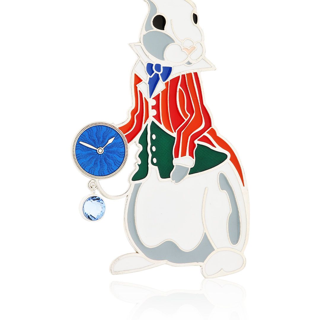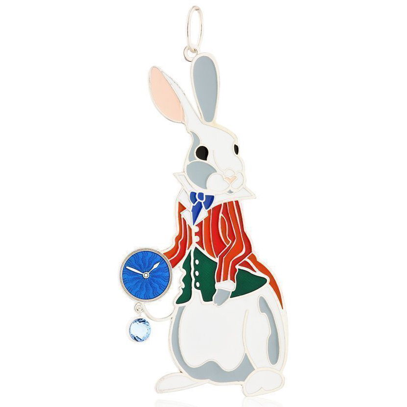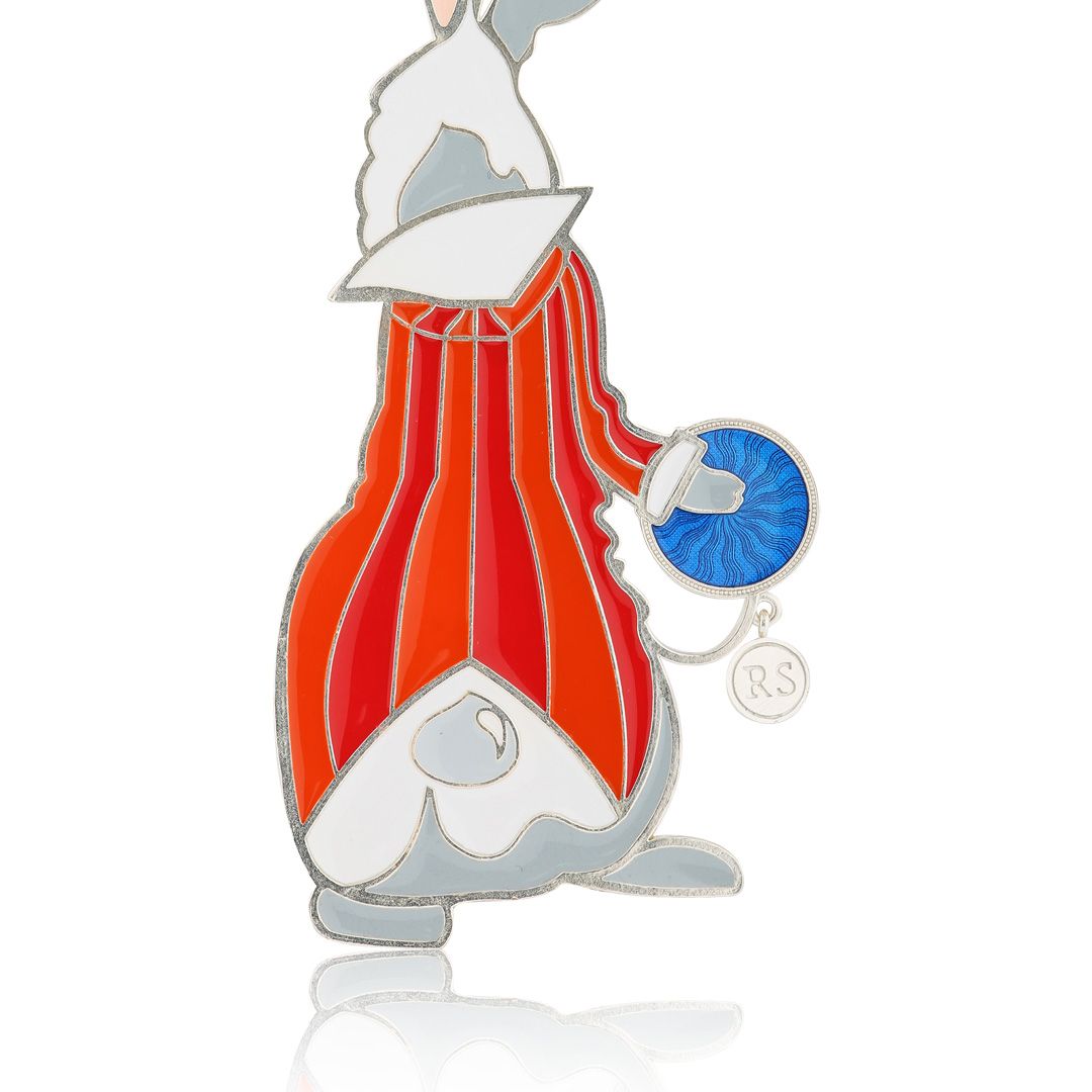 Ёлочная игрушка в виде Белого Кролика выполнена из латуни с ювелирной эмалью и стеклом, отсылая к образу из классики британской литературы и одновременно играя с эстетикой коллекционного арт-деко. На Кролике красуется полосатый сюртук цвета красного вина, жилет изумрудного оттенка и голубой бантик — наряд, достойный светского персонажа викторианской эпохи. В лапках — миниатюрные часы с ультрамариновой эмалью циферблата, украшенные подвесом с сияющим голубым кристаллом. Каждый элемент композиции продуман до мелочей, создавая не просто новогоднее украшение, а театрализованную миниатюру с характером и сюжетом.