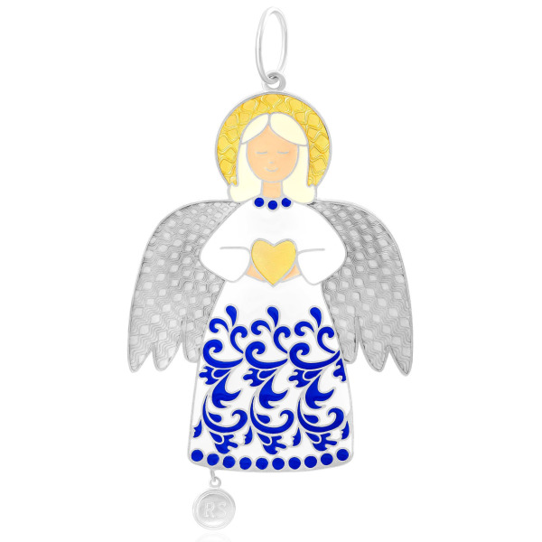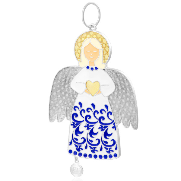 Изящная ёлочная игрушка в виде ангела выполнена из серебра 925 пробы и предназначена для тех, кто умеет находить поэзию в деталях. В образе воплощена светлая тишина рождественской ночи: небесный посланник с закрытыми глазами бережно прижимает к груди золотое сердце — знак безмолвной любви и вечной заботы. Его крылья изящно выгравированы тонким орнаментом, создающим эффект трепета в воздухе, а риза украшена кобальтово-синим узором, вдохновлённым традиционной русской декоративной росписью. Завершающий штрих — миниатюрная круглая подвеска с монограммой, завершающая образ утончённым акцентом.