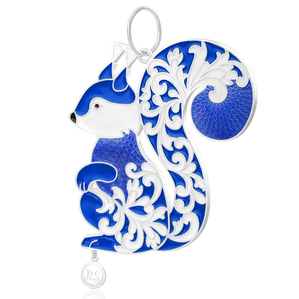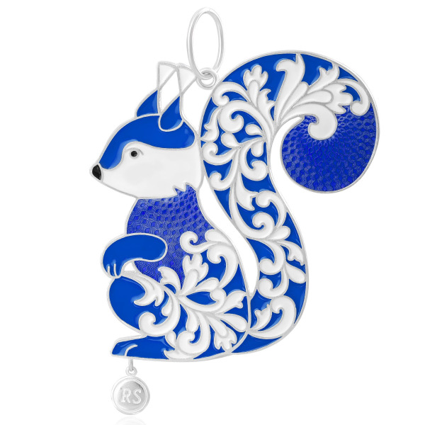 Серебряная ёлочная игрушка в виде белки воплощает очарование северной природы и грациозную выразительность декоративного искусства. Композиция выстроена в лаконичном силуэте: изогнутая спинка, пушистый хвост, изящно поднятые лапки. Вся поверхность фигурки украшена рельефным растительным орнаментом, залитым горячей эмалью глубокого кобальтово-синего цвета. Чередование плотного цвета и фактурного серебра создаёт живой ритм света и тени. Нижняя часть украшения дополнена миниатюрной авторской медалью, завершающей образ благородным акцентом.