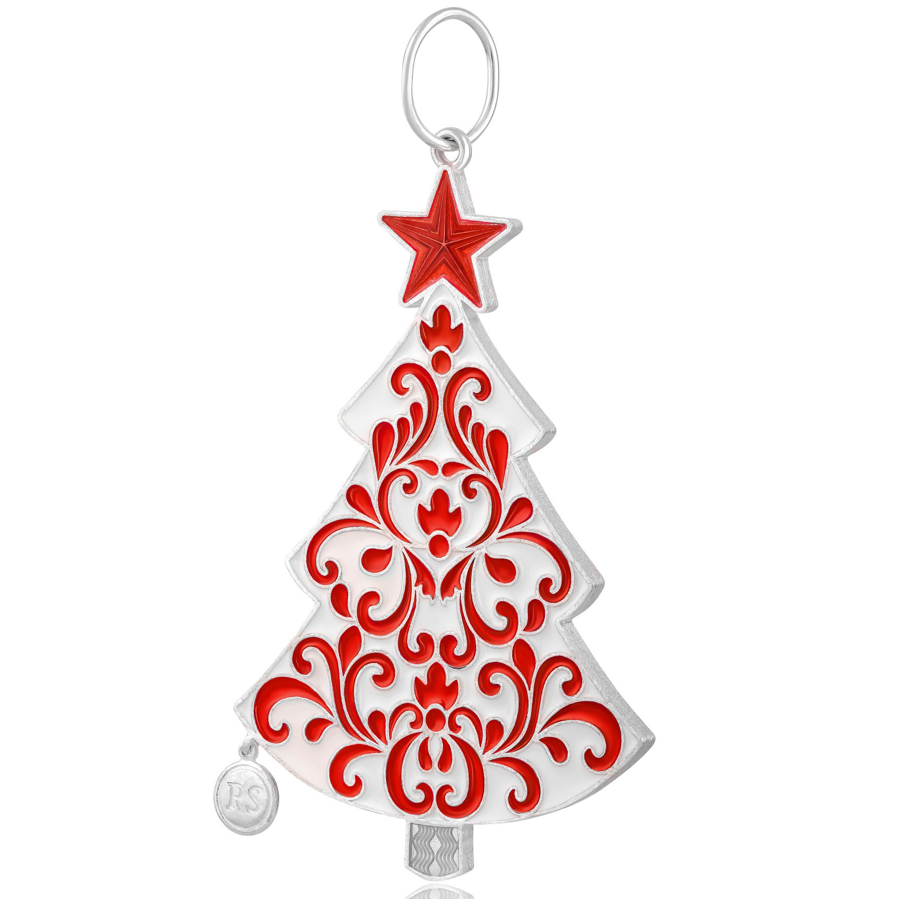 Серебряная ёлочная игрушка в виде стилизованной новогодней ели воплощает торжественность и величие праздничного ритуала, получившего свою форму в императорской России и сохранившего ауру аристократического великолепия. Безукоризненно выверенный силуэт украшен яркой пятиконечной звездой, напоминающей о традиции венчать ёлку главным символом света и надежды. По поверхности кроны разливается узор из красной горячей эмали, созданный с тонкостью, присущей ювелирному ремеслу. Изящный подвес завершает композицию, а клеймо с инициалами мастера подтверждает подлинность и уникальность исполнения.