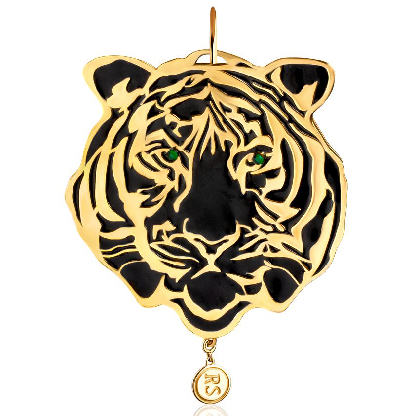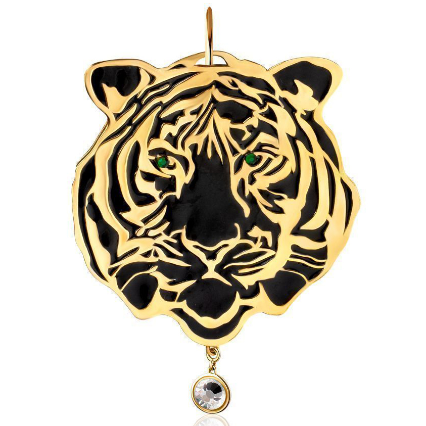 Ёлочная игрушка в виде тигриной морды создана из серебра с чернением и позолотой, Хищный образ здесь превратился в символ силы, роскоши и величия. Стремительный рельеф рисунка повторяет линии тигриного окраса, контрастно чередуя матовый чёрный с благородным золотым блеском. Пронзительный взгляд, собранный в зелёных вставках глаз, приковывает внимание, подчёркивая царственную независимость животного. В нижней части украшения закреплён сияющий камень, заключённый в позолоченную оправу, придающий всей композиции завершённость и аллюзию на охотничий трофей.