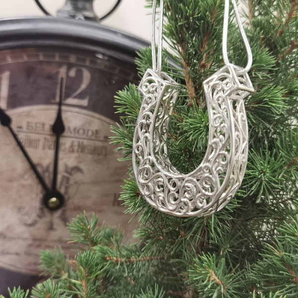 Подкова — это пожалуй самый сильный оберег, который сегодня пользуется огромной популярностью как в России так и за рубежом, особенно в странах Европы и США. Значение подковы как оберега состоит в том, что она способна притянуть успех, достаток, благополучие; улучшить финансовое состояние; защитить жилье и его обитателей от плохой энергетики — сглаза, порчи, пожаров, воровства; сохранять гармонию и спокойствие в семье; помочь сберечь или обрести любовь. Наша елочная игрушка "Подкова" станет прекрасным подарком-оберегом для коллеги, руководителя или близкого человека. Коллекционная игрушка "Подкова" изготовлена из серебра 925 пробы. Детализация элементов и качество обработки достигаются благодаря использованию ручного труда.