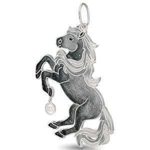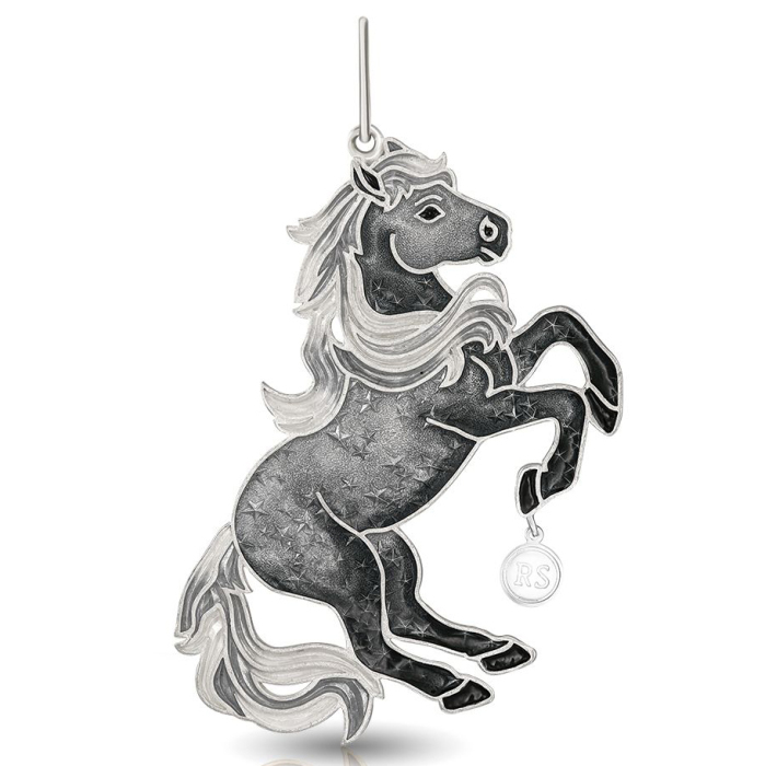 Ювелирная елочная игрушка «Серебряная лошадь» создана как тонкая графическая миниатюра, в которой благородный блеск серебра 925 пробы сочетается с глубокими, холодными оттенками эмалевого покрытия. Фигура вздыбленной лошади, исполненная в серебристо-дымчатой палитре, передана с особой пластичностью: линия гривы тянется легкой волней, силуэт конечностей сформирован точно и динамично, создавая впечатление стремительного движения, застывшего в воздухе. Легкое зернение поверхности подчёркивает характер металла и придаёт композиции дополнительную выразительность.