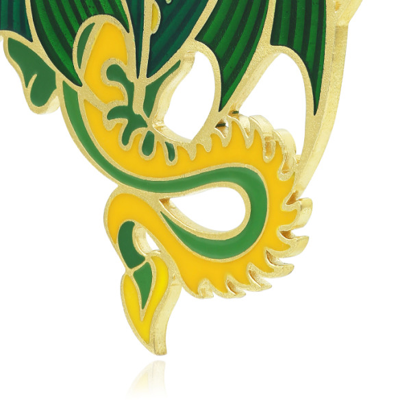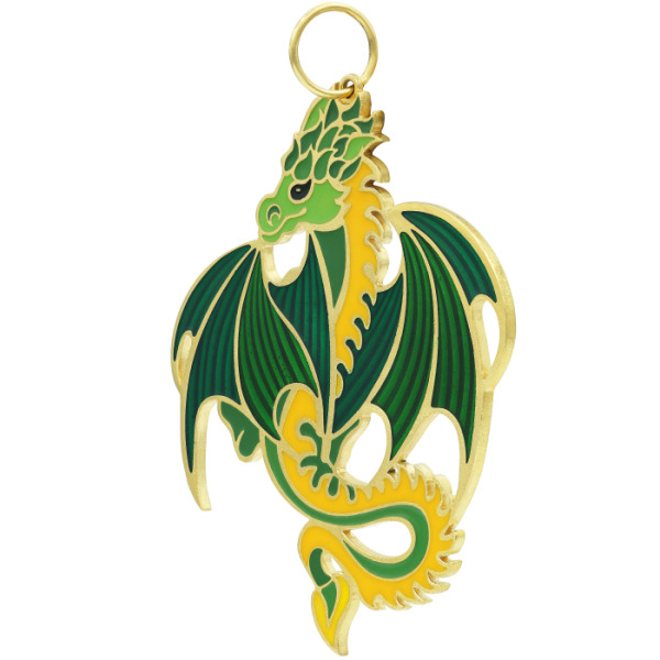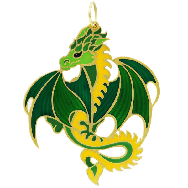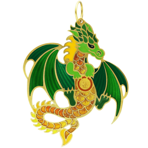 Ювелирная ёлочная игрушка в форме дракона — смелый и харизматичный акцент для новогоднего убранства, способный выразить индивидуальность и силу характера владельца. Выполненная из ювелирного металла с гальваническим золотым покрытием, фигура поражает сочностью красок: насыщенные оттенки изумрудного, зелёного яблока и жёлтого пламени соединены в энергичную композицию, в центре которой — дракон с крыльями, распахнутыми в полёте. В одной из лап он сжимает символический круг, напоминающий китайскую монету, что придаёт изделию мотив защиты, власти и богатства.