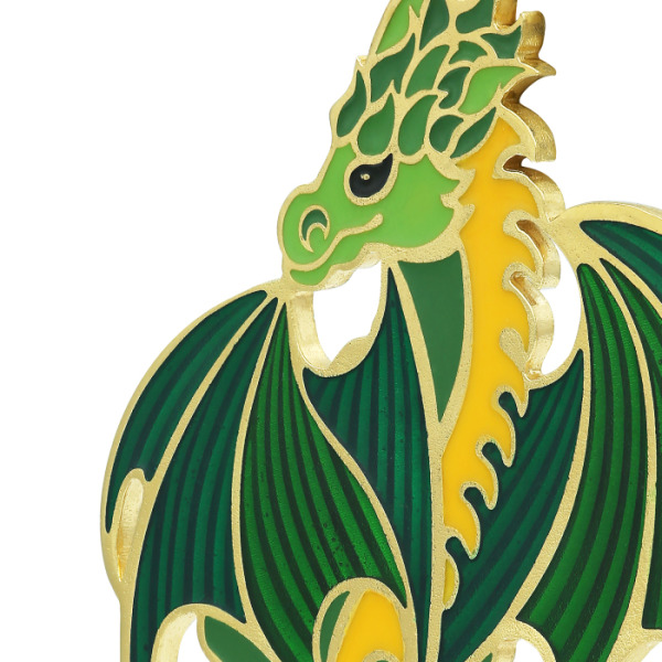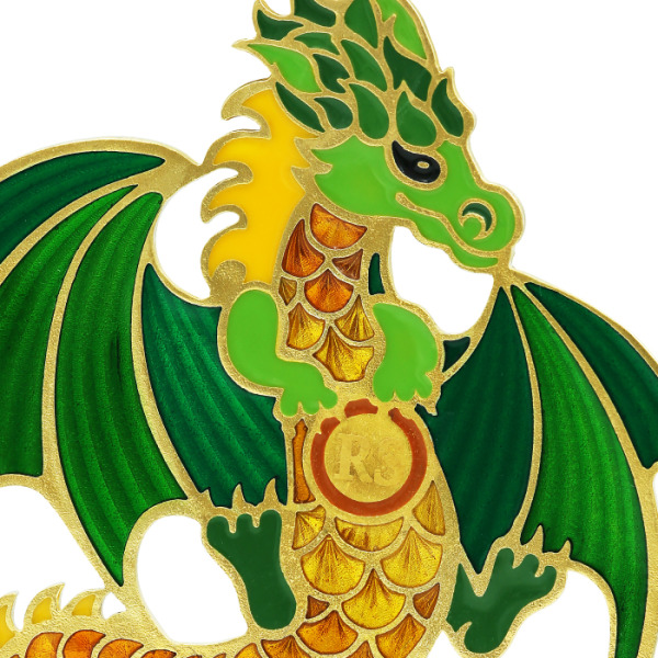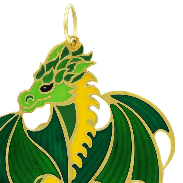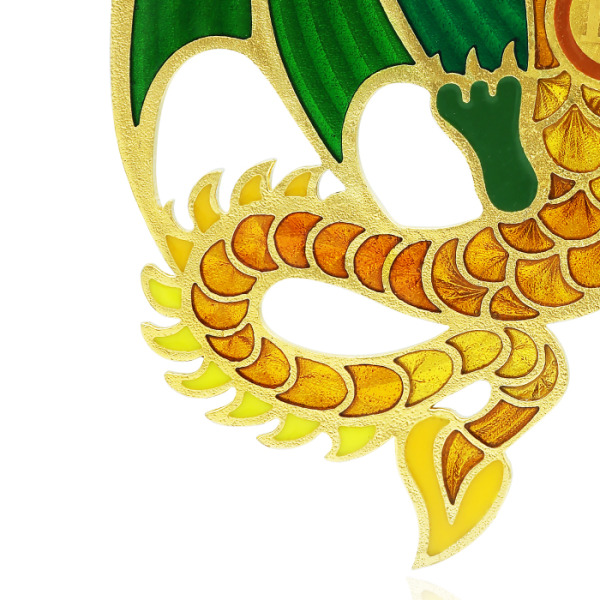 Игрушка создана вручную в технике горячей эмали: полупрозрачные цветные слои наносятся в замкнутые перегородки, выложенные по контуру, после чего изделие проходит обжиг при высокой температуре. Этот сложный процесс позволяет достичь блеска, насыщенности цвета и идеальной гладкости. Особую выразительность добавляет контраст между прозрачными и непрозрачными участками, а чёткие грани золотого металла подчеркивают характер драконьей формы, придавая объём и глубину.