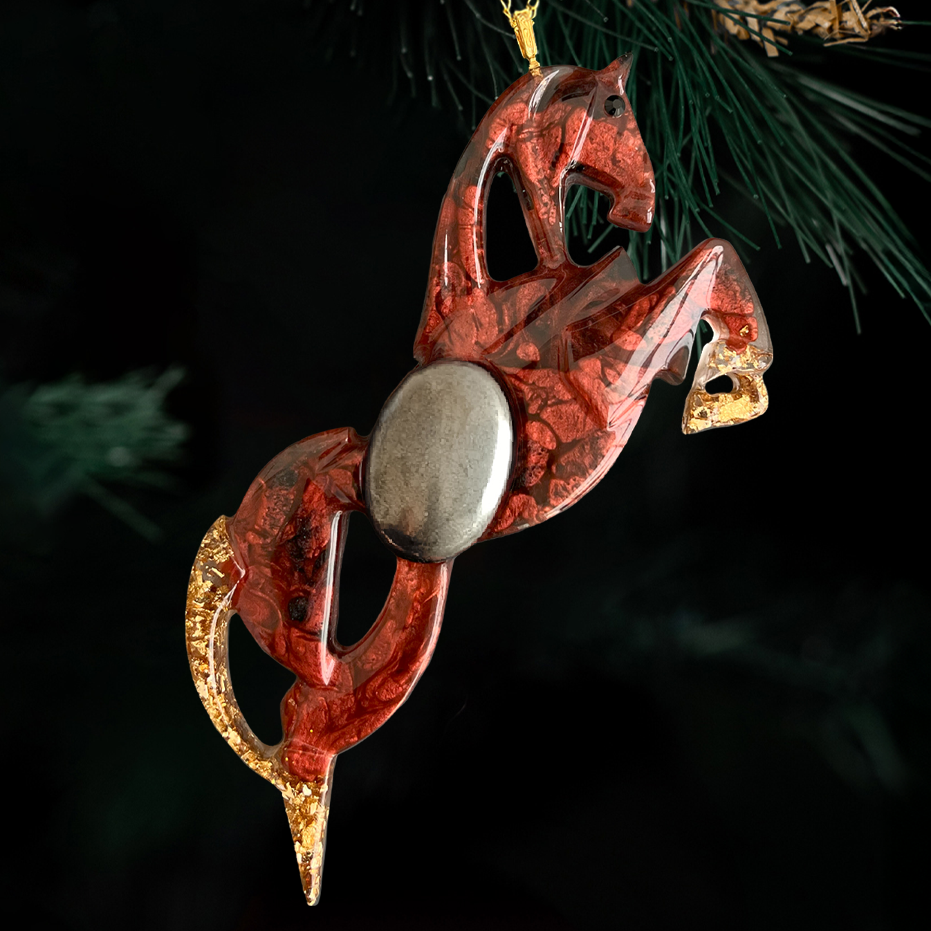 2026 год — год Огненной Лошади, чей образ подобен яркому пламени, способному озарить путь к мечтам и достижениям. Вдохновившись этим символом, мы создали эксклюзивную ёлочную игрушку в стиле абстрактного искусства. Фигура, вручную выполненная из ювелирной смолы, застыла в движении, словно стремясь вырваться за границы возможного, демонстрируя энергию и порыв.