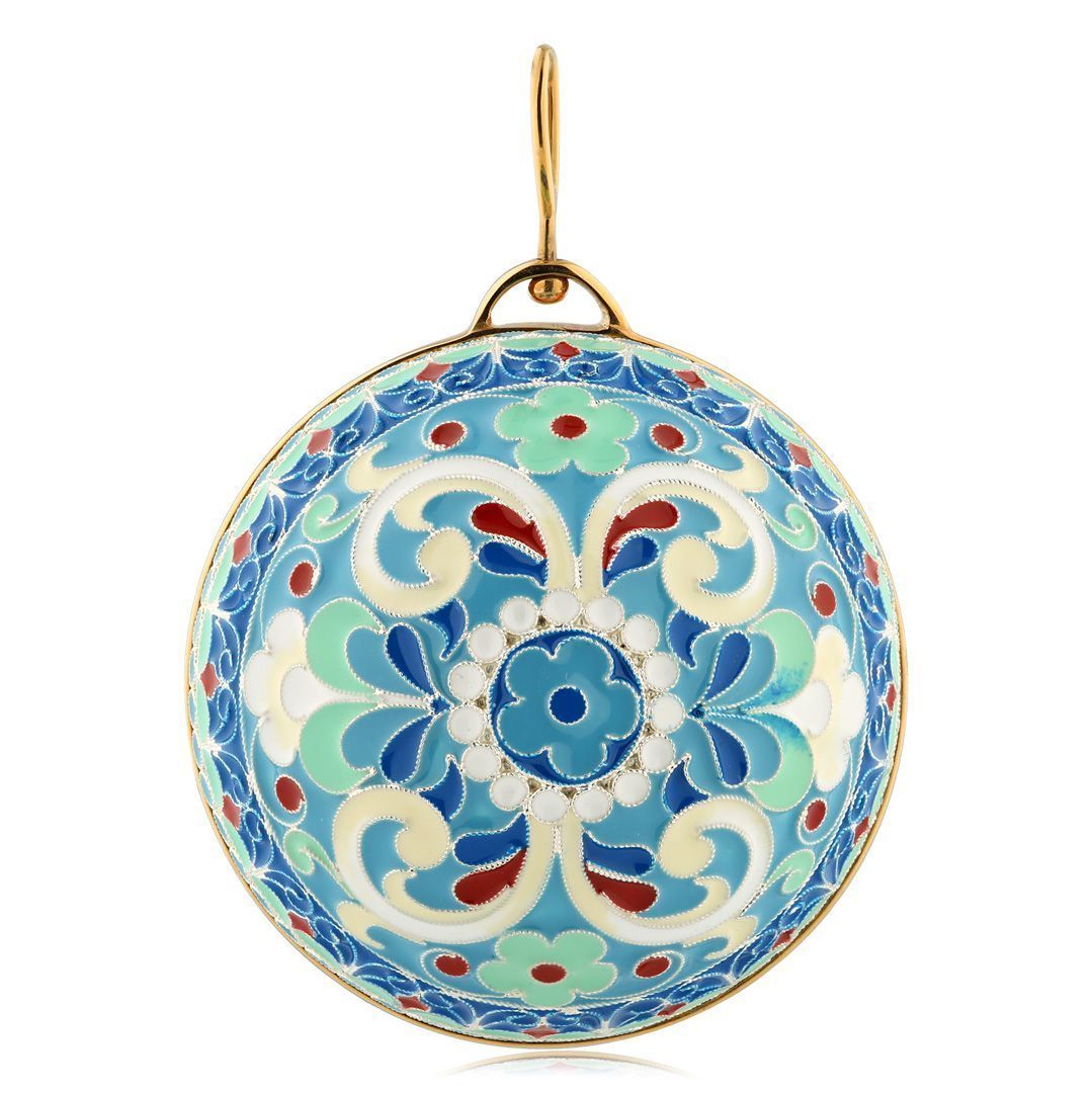 Мастерство исполнения основано на сложной эмалево-филигранной технике: каждая деталь узора очерчена тончайшей серебряной перегородкой, вручную заполненной горячей эмалью. Эмали разных цветов соединяются на одном поле с безупречной точностью, сохраняя контурную чёткость и выразительность. Голубой оттенок, положенный в несколько слоёв, играет полупрозрачным блеском, а насыщенные акценты — тёмно-синие, мятные и винные — создают объём, словно в витраже. Тончайшие линии и многослойность цветов делают этот предмет настоящим произведением ювелирного искусства.