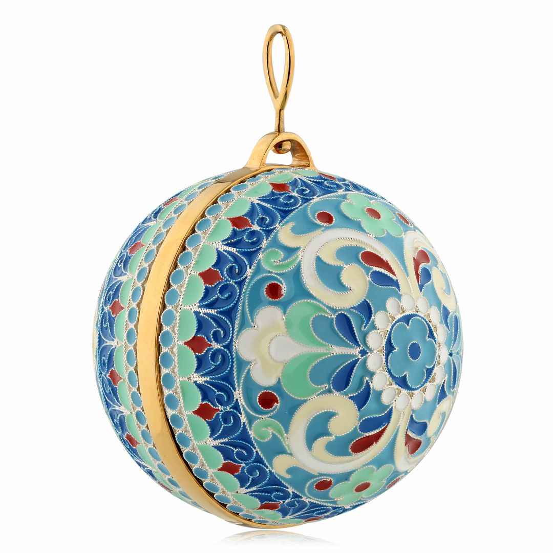 Ёлочный шар "Расписной" из серебра — образец тончайшего декоративного искусства, воплотивший в себе традиции русского орнамента в драгоценной форме. Светлый, многослойный голубой фон наполняет шар ощущением прохлады и безмятежности, а сложный растительный узор, исполненный в белом, небесно-синем, мятном и винном оттенках, создаёт изысканную ритмику и глубину. В центре композиции — цветок с лепестками и жемчужным обрамлением, словно перекликающийся с древними образцами эмалевых эмблем. Мягкий контраст оттенков подчеркнут позолоченным кантом, проходящим по экватору и венчающим образ торжественным сиянием.