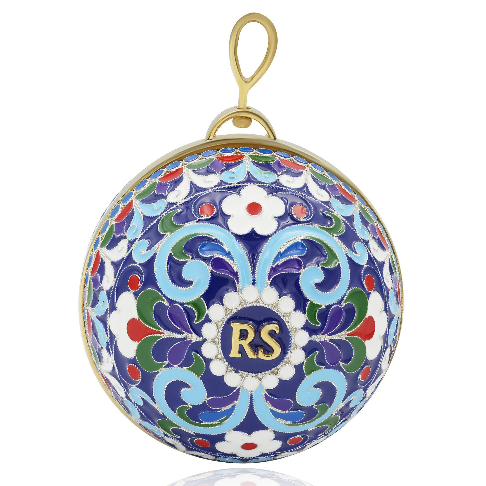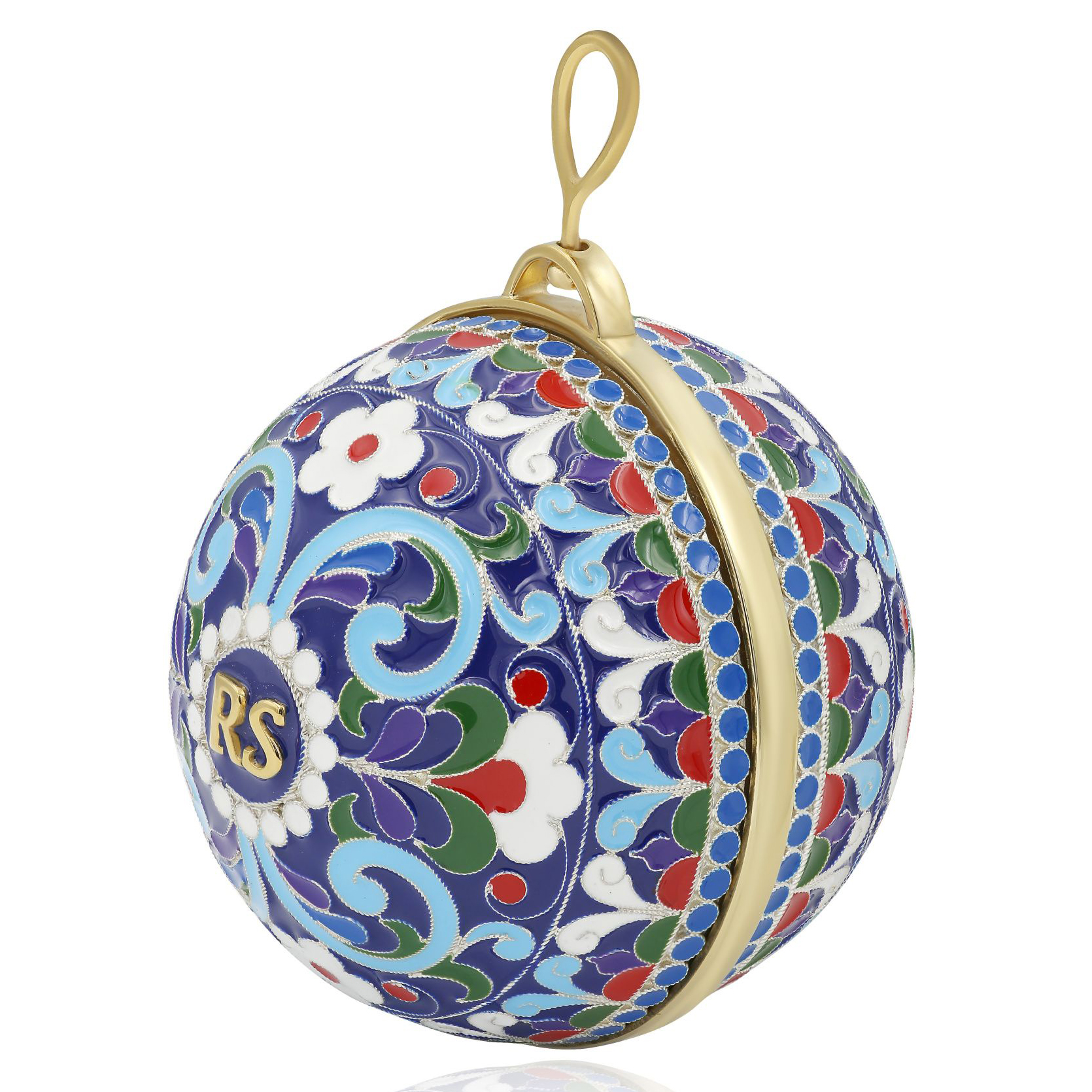 Ёлочный шар "Расписной" из серебра — образец тончайшего декоративного искусства, воплотивший в себе традиции русского орнамента в драгоценной форме. Глубокий, многослойный синий фон наполняет шар ощущением торжественности и величия, а сложный растительный узор, исполненный в белом, небесно-голубом, мятном и винном оттенках, создаёт изысканную ритмику и глубину. В центре композиции — цветок с лепестками и жемчужным обрамлением, словно перекликающийся с древними образцами эмалевых эмблем. Мягкий контраст оттенков подчеркнут позолоченным кантом, проходящим по экватору и венчающим образ торжественным сиянием.