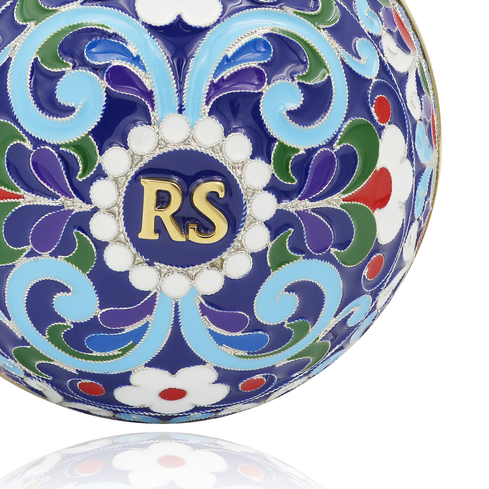 Мастерство исполнения основано на сложной эмалево-филигранной технике: каждая деталь узора очерчена тончайшей серебряной перегородкой, вручную заполненной горячей эмалью. Эмали разных цветов соединяются на одном поле с безупречной точностью, сохраняя контурную чёткость и выразительность. Синий оттенок, положенный в несколько слоёв, играет полупрозрачным блеском, а насыщенные акценты — тёмно-голубые, мятные и винные — создают объём, словно в витраже. Тончайшие линии и многослойность цветов делают этот предмет настоящим произведением ювелирного искусства.