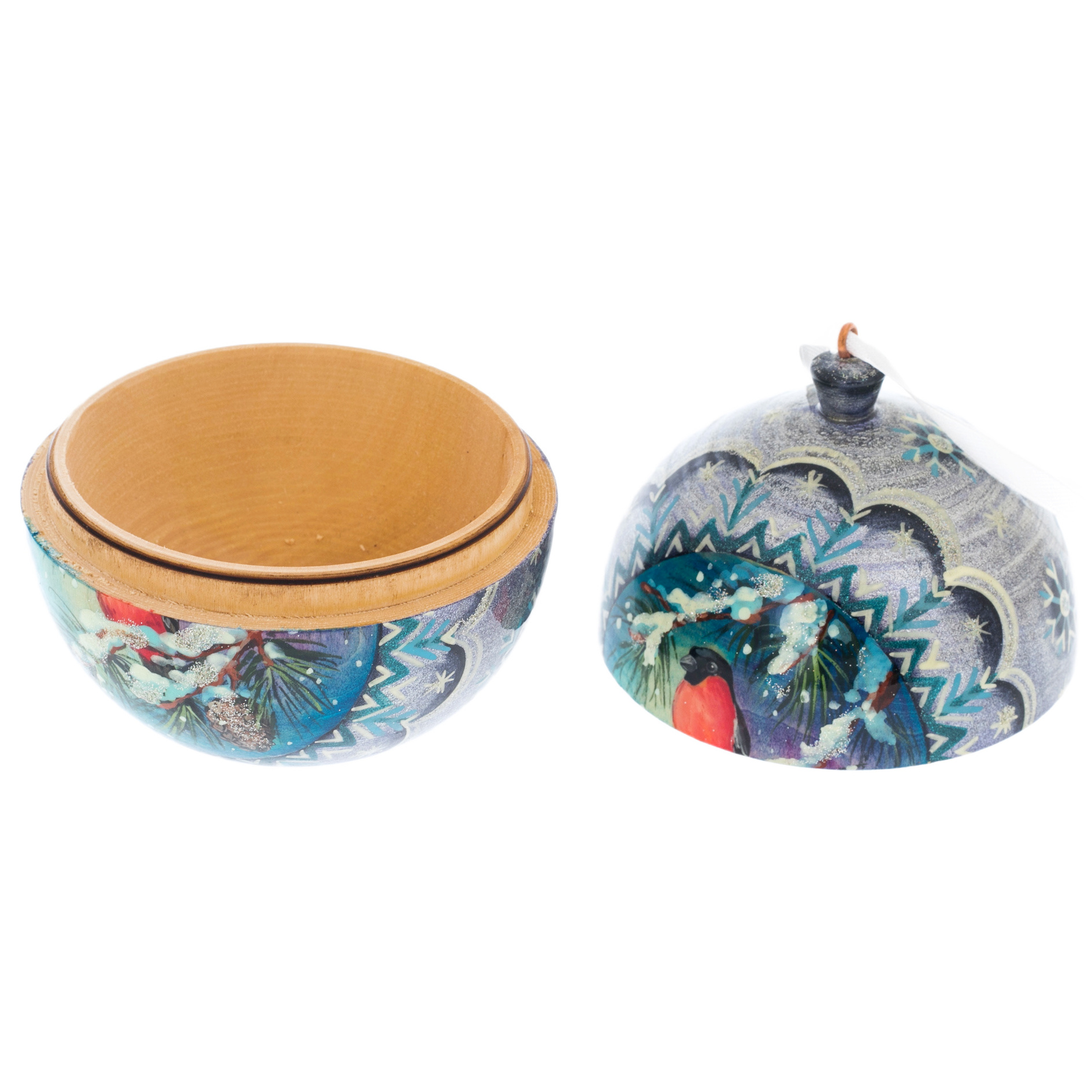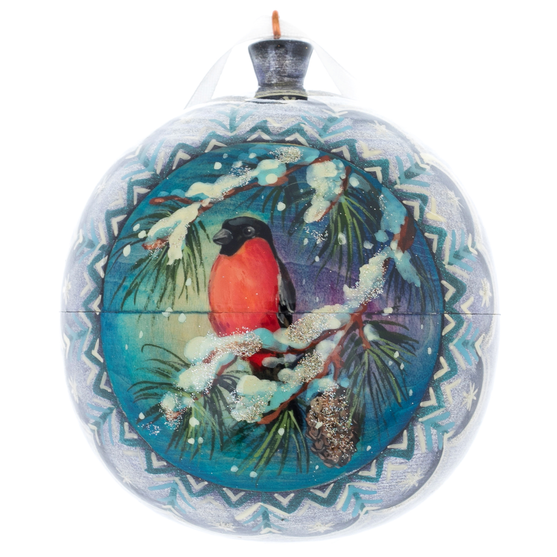 Ёлочный шар-шкатулка "Снегирь на ели" сиреневый