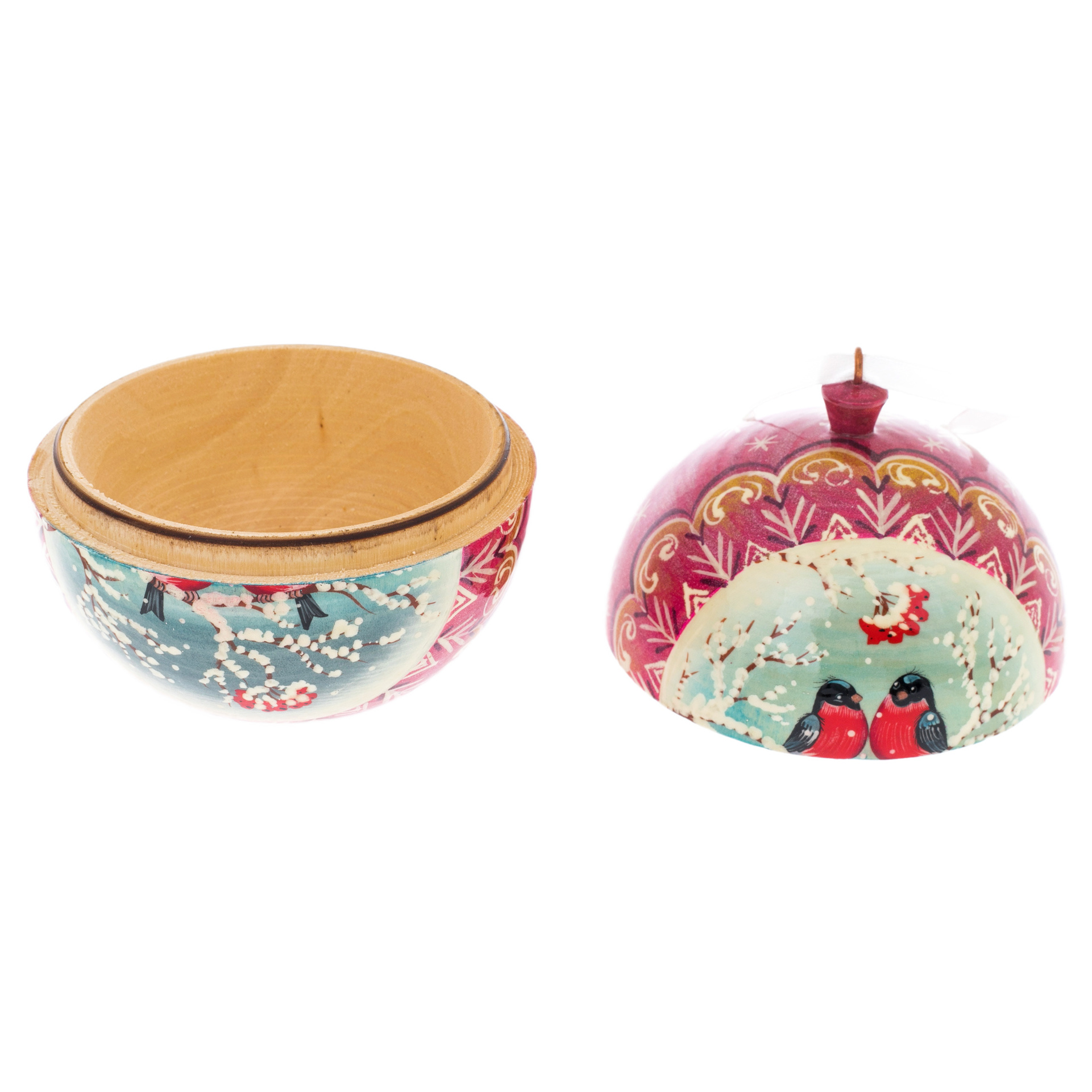 Внутри шар скрывает маленькое пространство, подобное тайнику, где можно спрятать что-то особенное — частицу своего новогоднего настроения или даже небольшую ценность, которая обретёт новое значение в окружении рождественских мотивов. Открывая этот шар, словно возвращаешься в детство, когда каждое новогоднее украшение казалось волшебным.