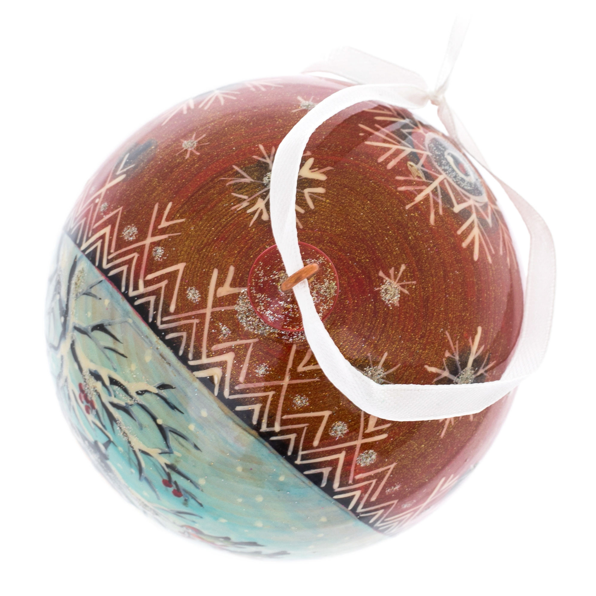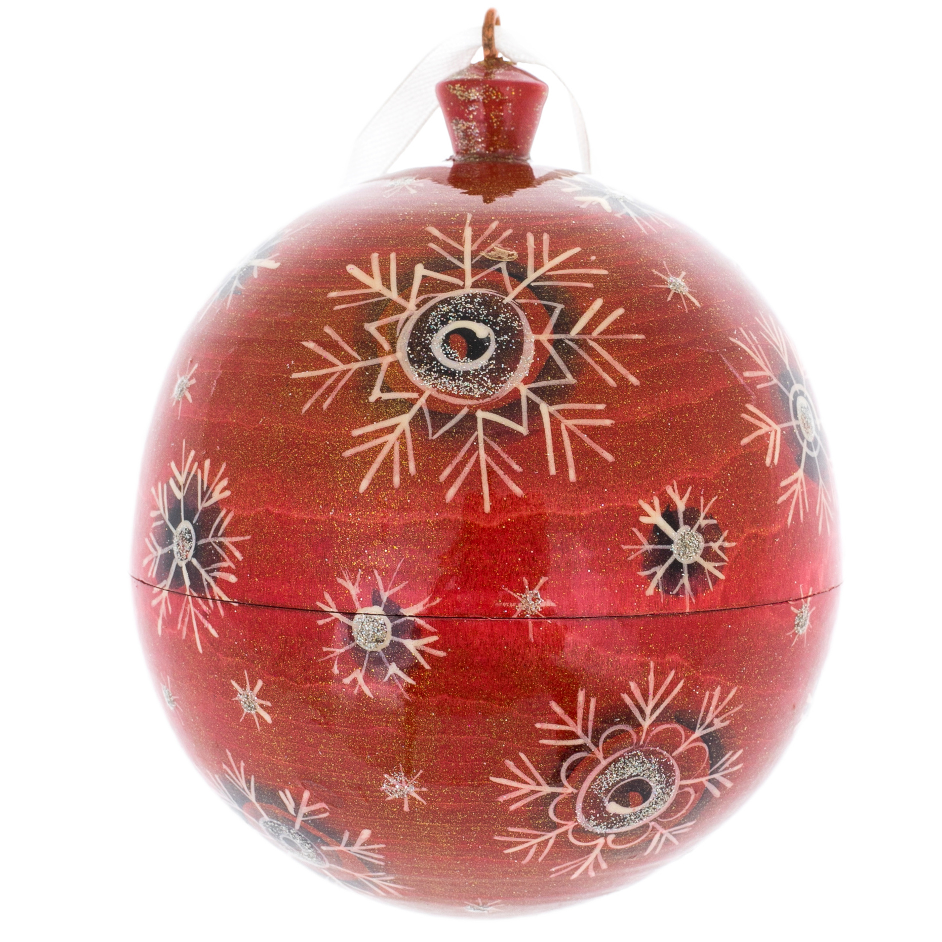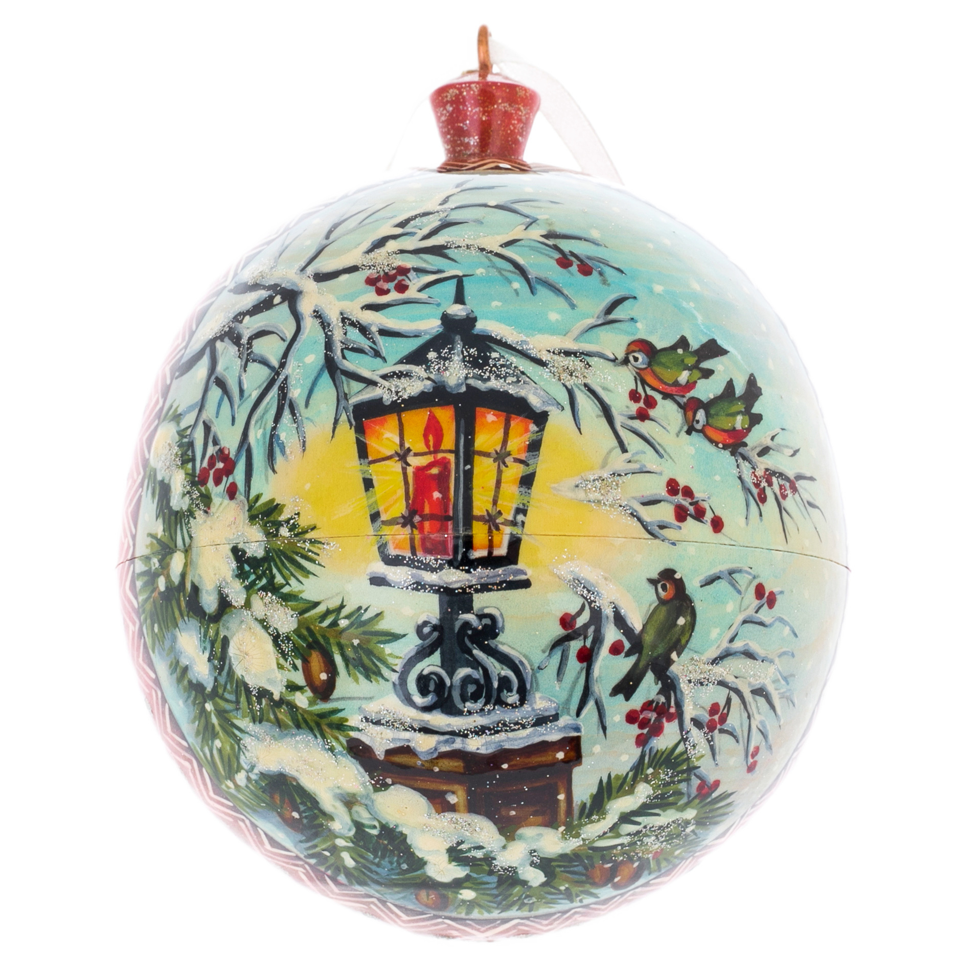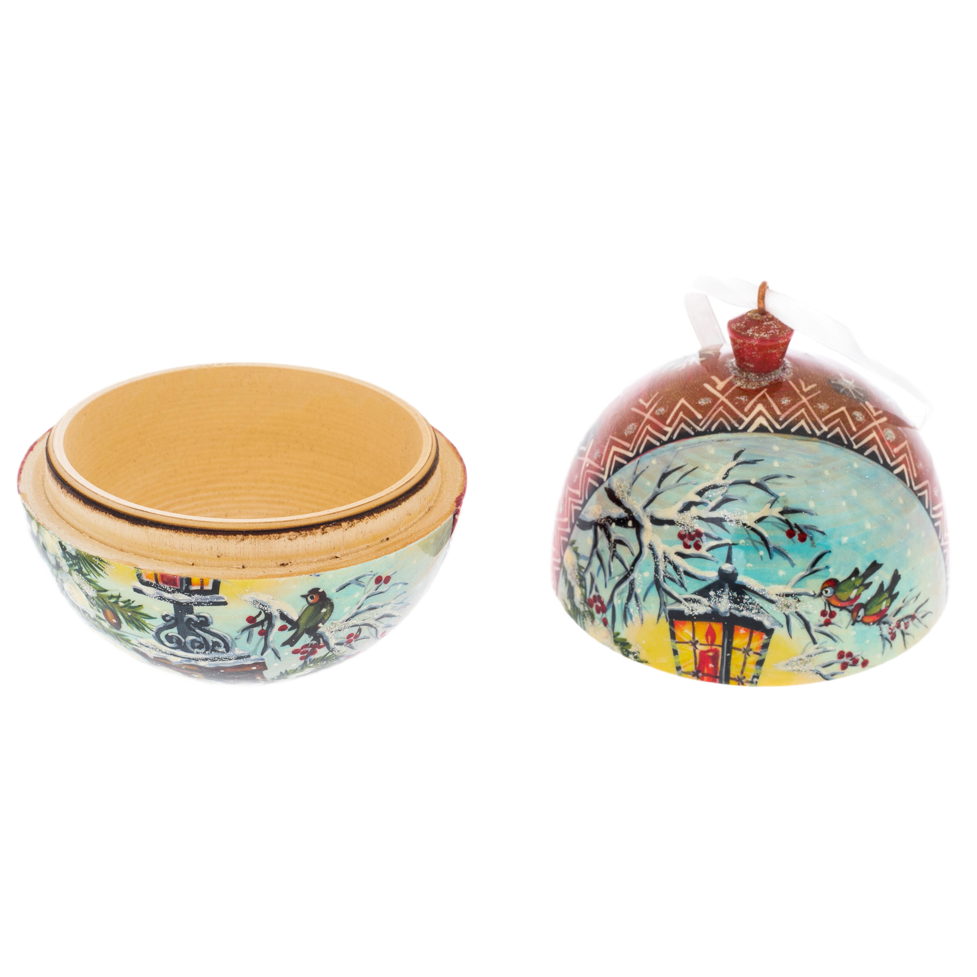 Ёлочный шар-шкатулка "Снегири у фонаря" красный