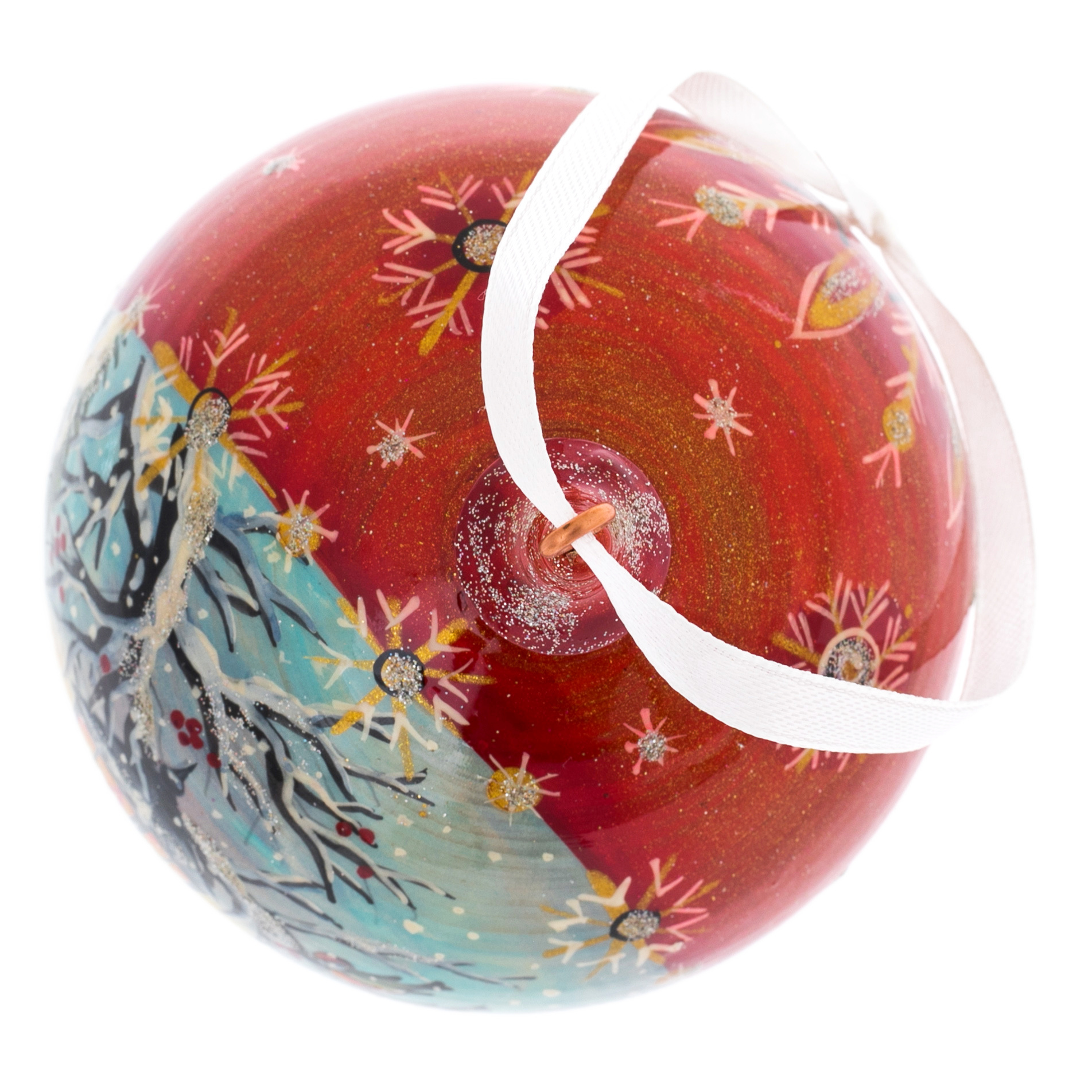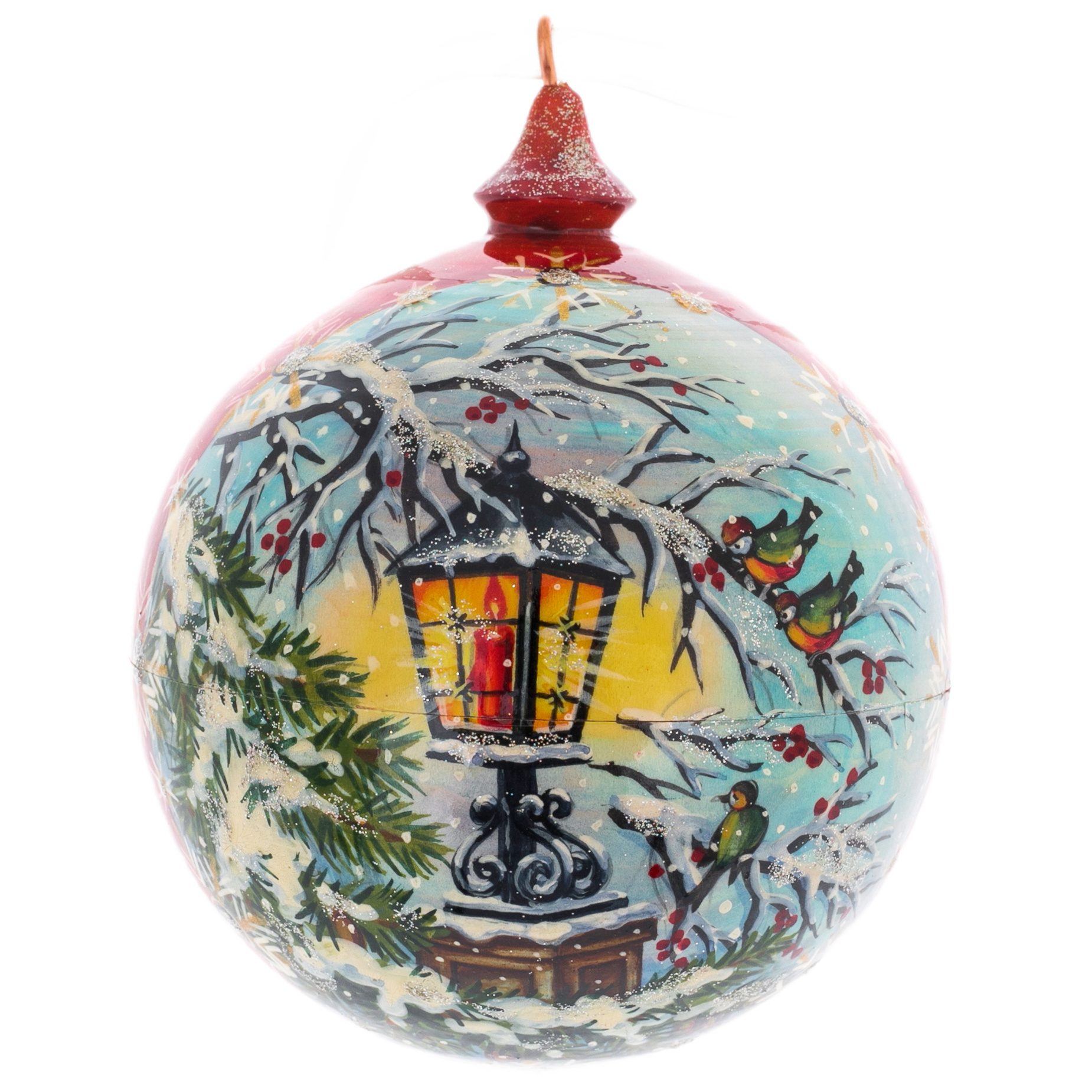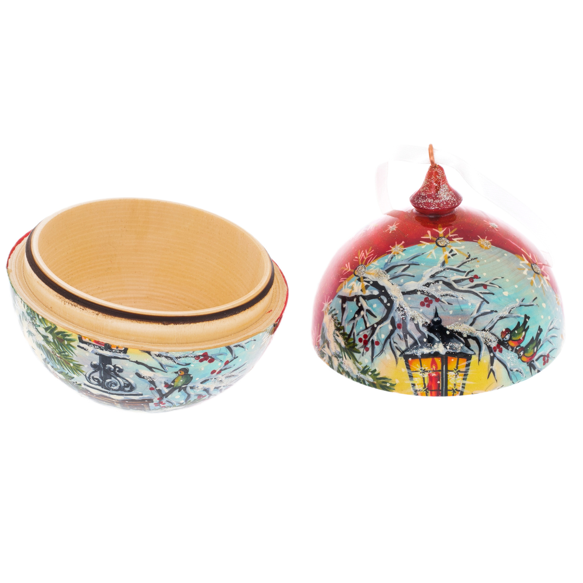 Ёлочный шар-шкатулка "Снегири у фонаря" красный