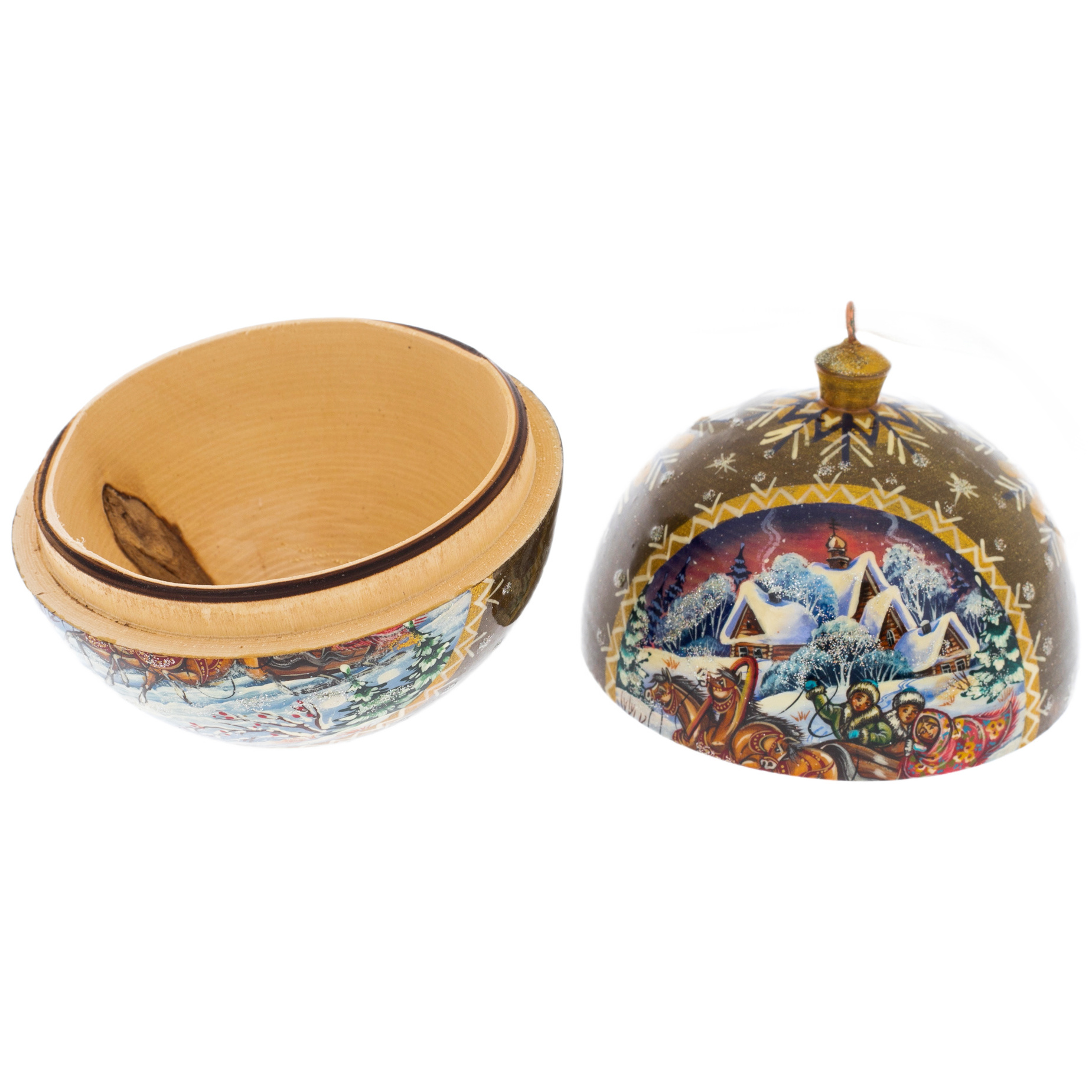 Внутри шар скрывает маленькое пространство, подобное тайнику, где можно спрятать что-то особенное — частицу своего новогоднего настроения или даже небольшую ценность, которая обретёт новое значение в окружении рождественских мотивов. Открывая этот шар, словно возвращаешься в детство, когда каждое новогоднее украшение казалось волшебным.