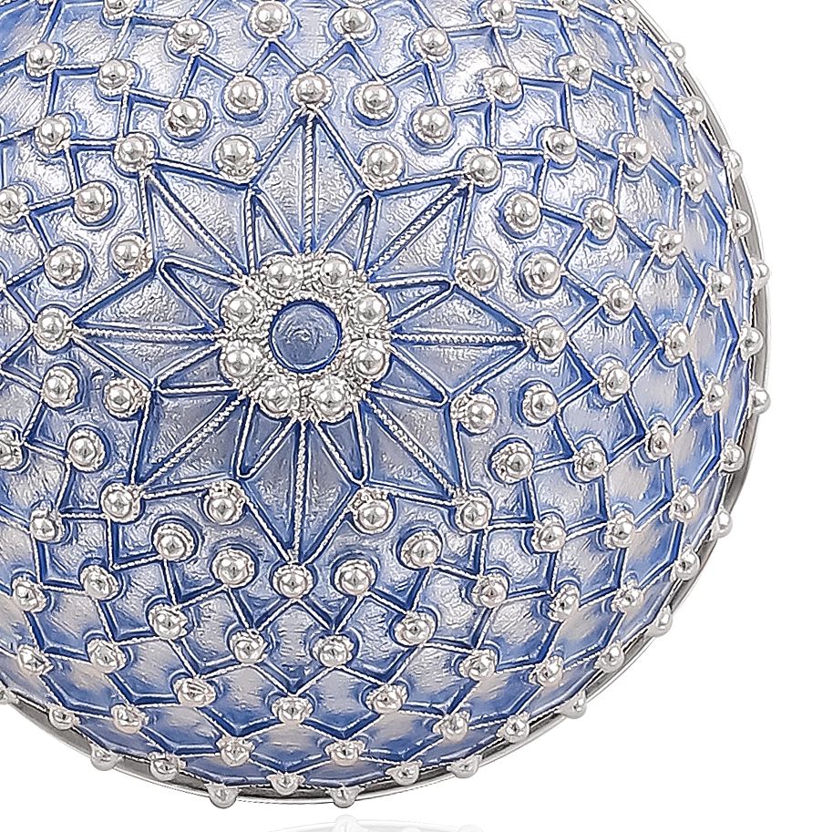 Техника исполнения требует редкой точности и знания старинных ремесленных школ. На основу наносится горячая эмаль голубого оттенка, глубина которого достигается многослойным прокаливанием. Затем мастер вручную обрамляет каждый участок узора серебряной нитью, придающей рельеф и подчёркивающей геометрию. Полусферы на пересечениях — результат филигранной ювелирной работы: каждую каплю крепят вручную, добиваясь идеальной симметрии и равномерного блеска. В результате рождается предмет, где тонкость орнамента сочетается с монументальной цельностью формы.