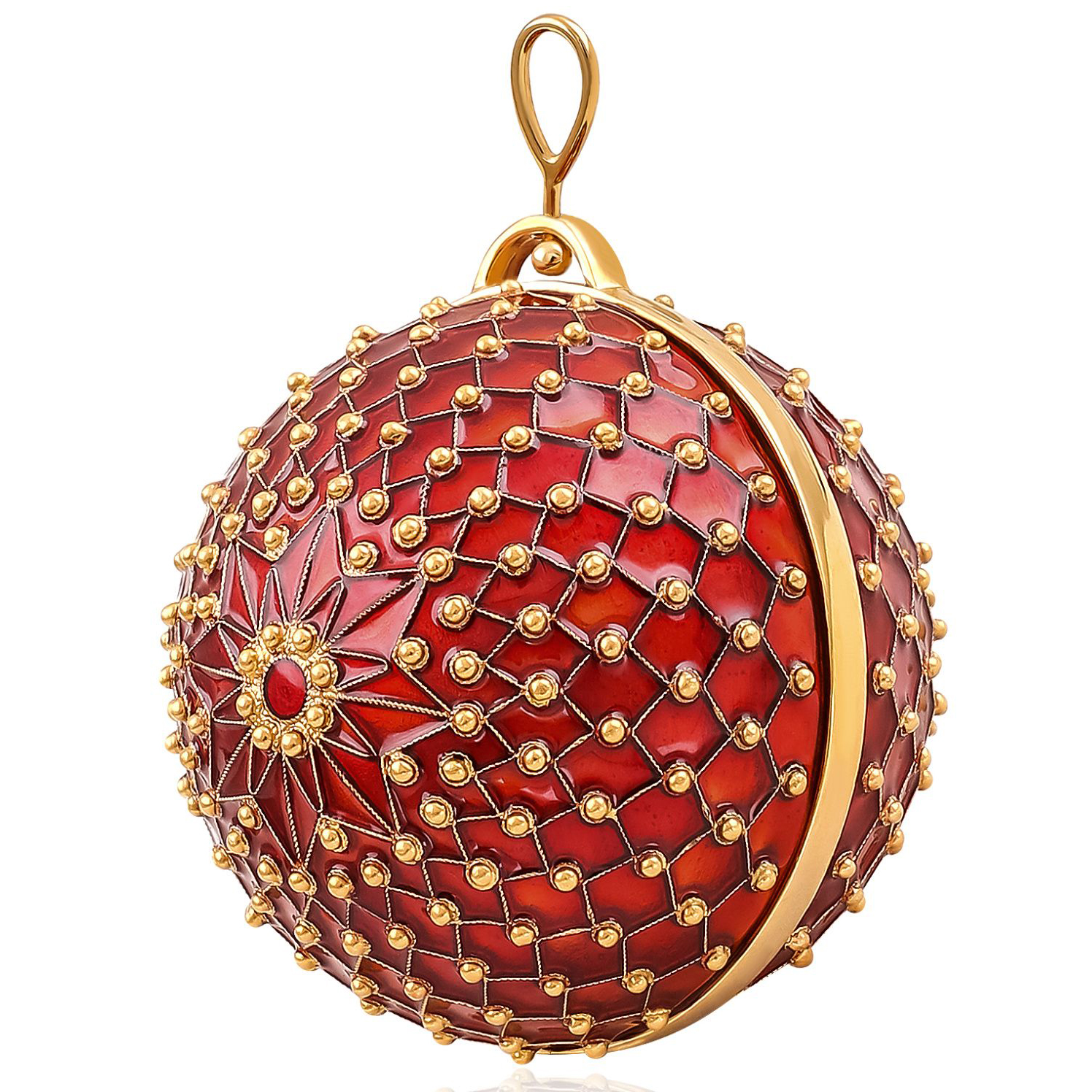 Ёлочная игрушка «Звезда» из серебра — это драгоценный акцент в убранстве рождественской ели, достойный коллекции музея декоративного искусства. Глубокий, насыщенный красный цвет шара словно вобрал в себя пламя свечи и бархатную теплоту зимнего вечера, а серебряная звезда с сияющим центром пробуждает ассоциации с путеводным светом, озаряющим путь к чуду. Поверхность игрушки обвита филигранной сеткой, украшенной каплями серебра в местах пересечения линий, будто бы созвездиями, замершими на куполе небосвода. Этот орнамент не просто декоративен — он ритмизирует поверхность, превращая изделие в ювелирный объект.
