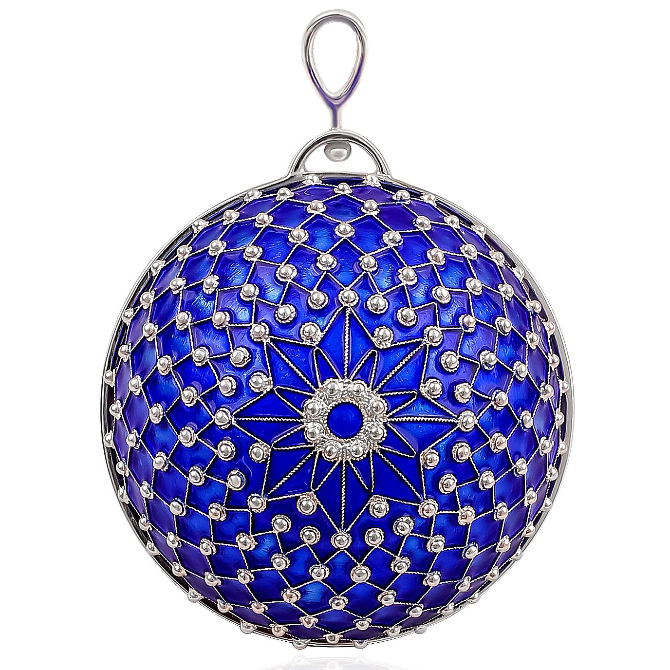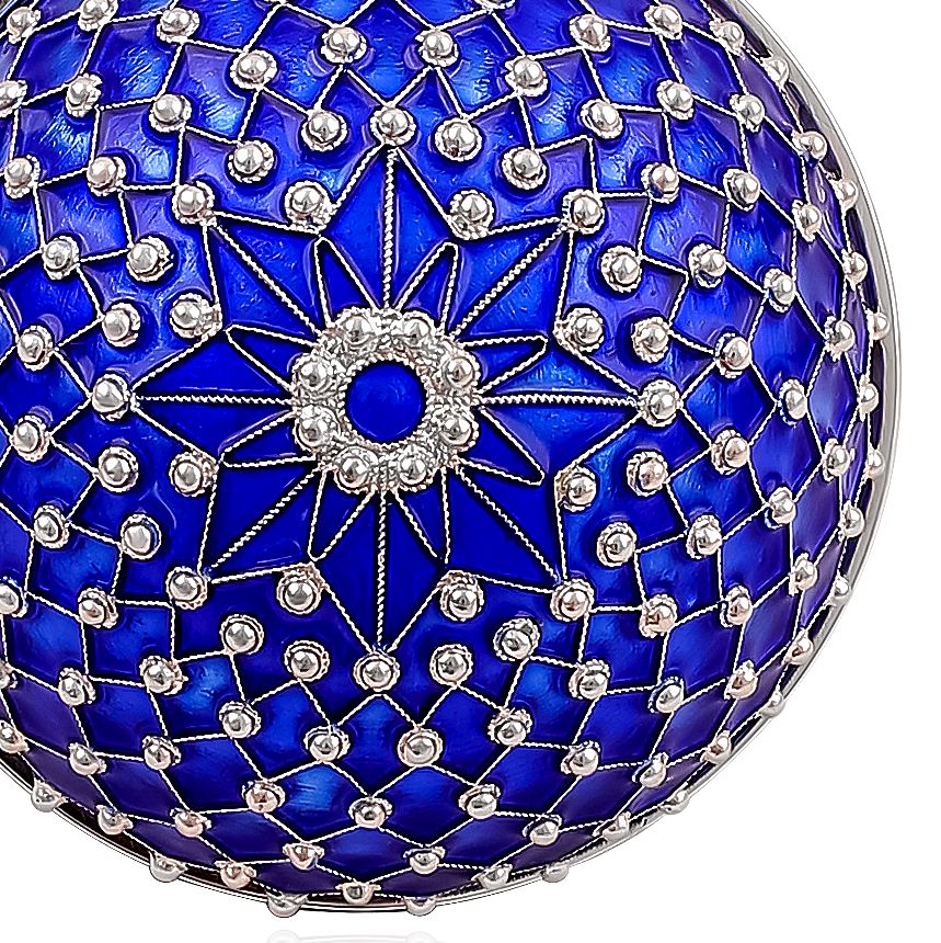 Ёлочная игрушка «Звезда» из серебра — это драгоценный акцент в убранстве рождественской ели, достойный коллекции музея декоративного искусства. Глубокий, насыщенный синий цвет шара словно вобрал в себя полночную тишину декабрьского неба, а серебряная звезда с сияющим центром пробуждает ассоциации с путеводным светом, озаряющим путь к чуду. Поверхность игрушки обвита филигранной сеткой, украшенной каплями серебра в местах пересечения линий, будто бы созвездиями, замершими на куполе небосвода. Этот орнамент не просто декоративен — он ритмизирует поверхность, превращая изделие в ювелирный объект.