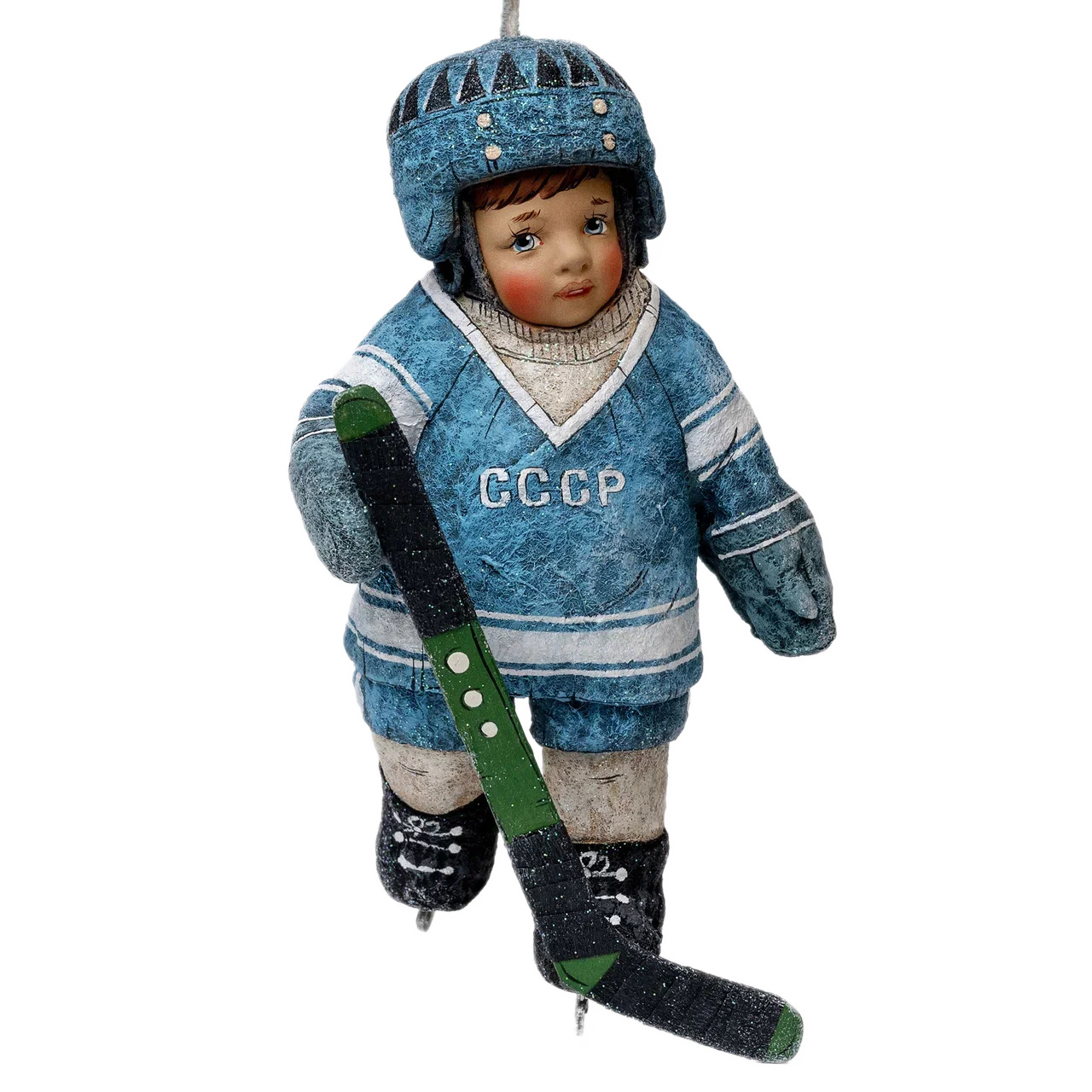 Коллекционная елочная ватная игрушка "Хоккеист СССР в синей форме" из коллекции "Профессии"
