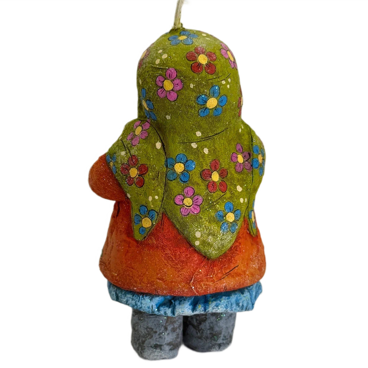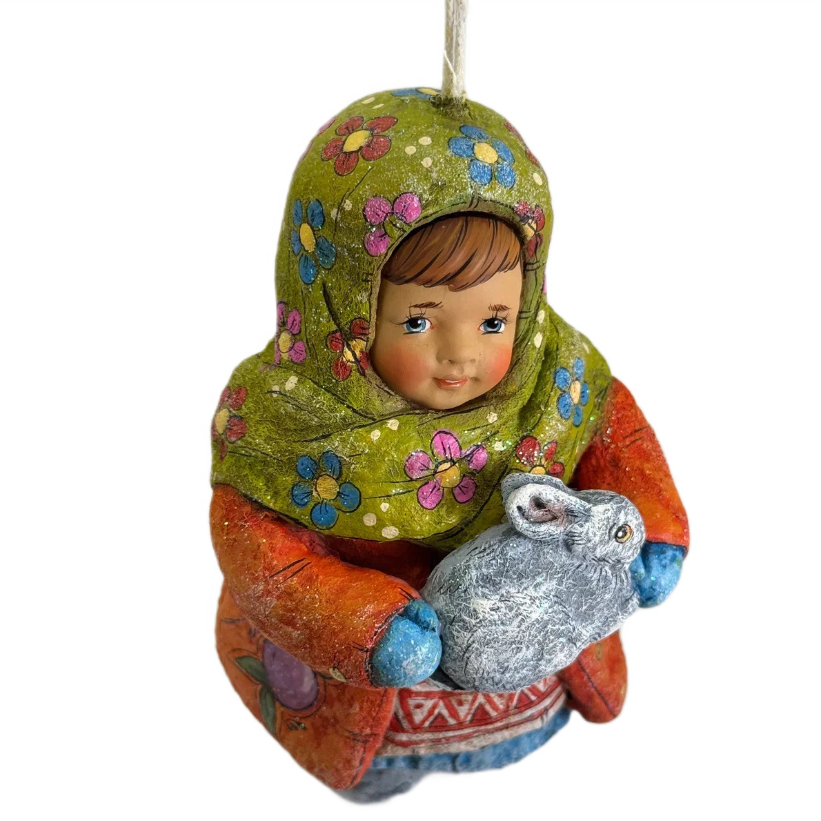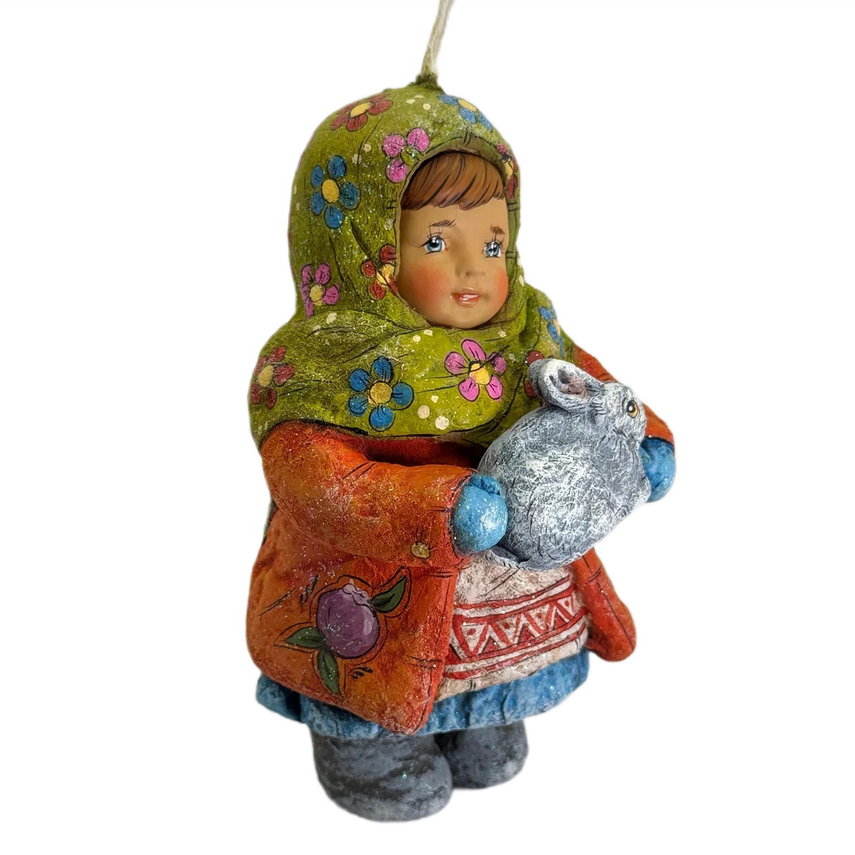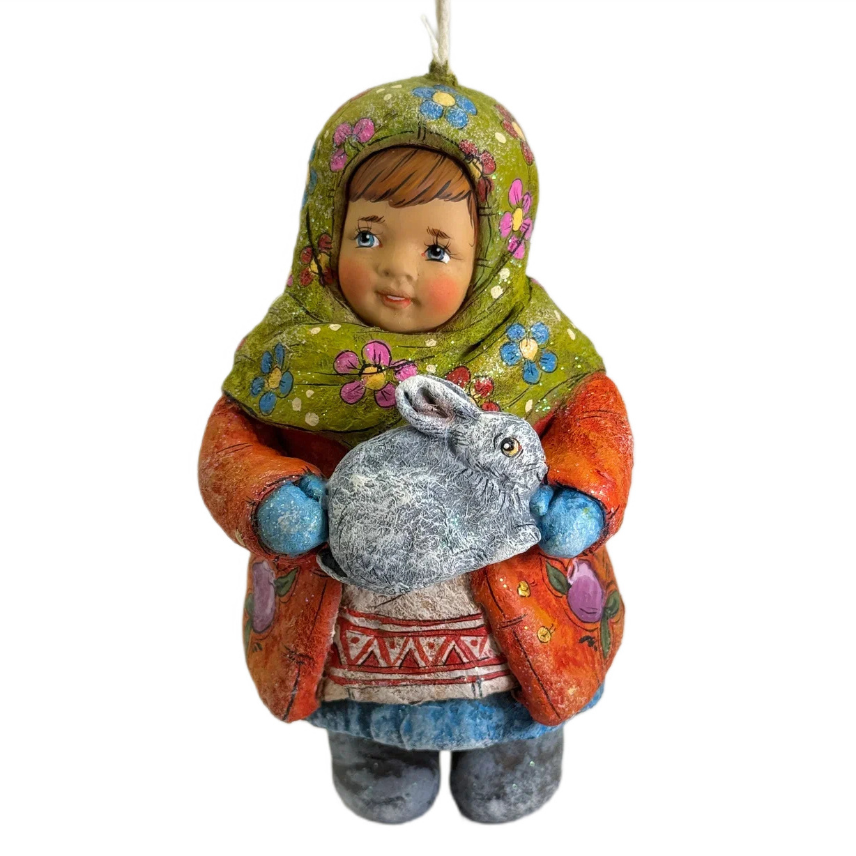 Коллекционная елочная ватная игрушка "Олюшка с зайчиком" из коллекции "Русский север"