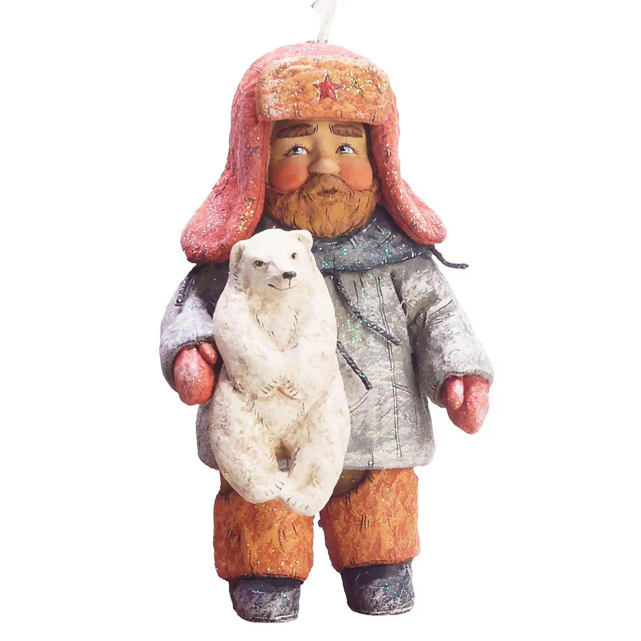 Коллекционная елочная ватная игрушка "Полярник с белым медвежонком" из коллекции "Арктика"