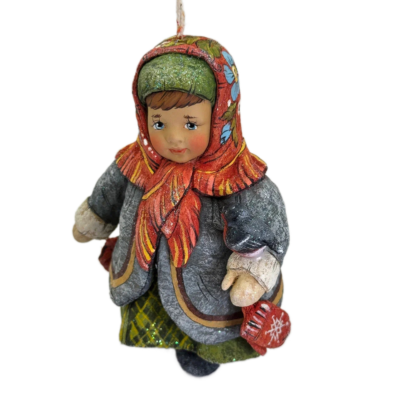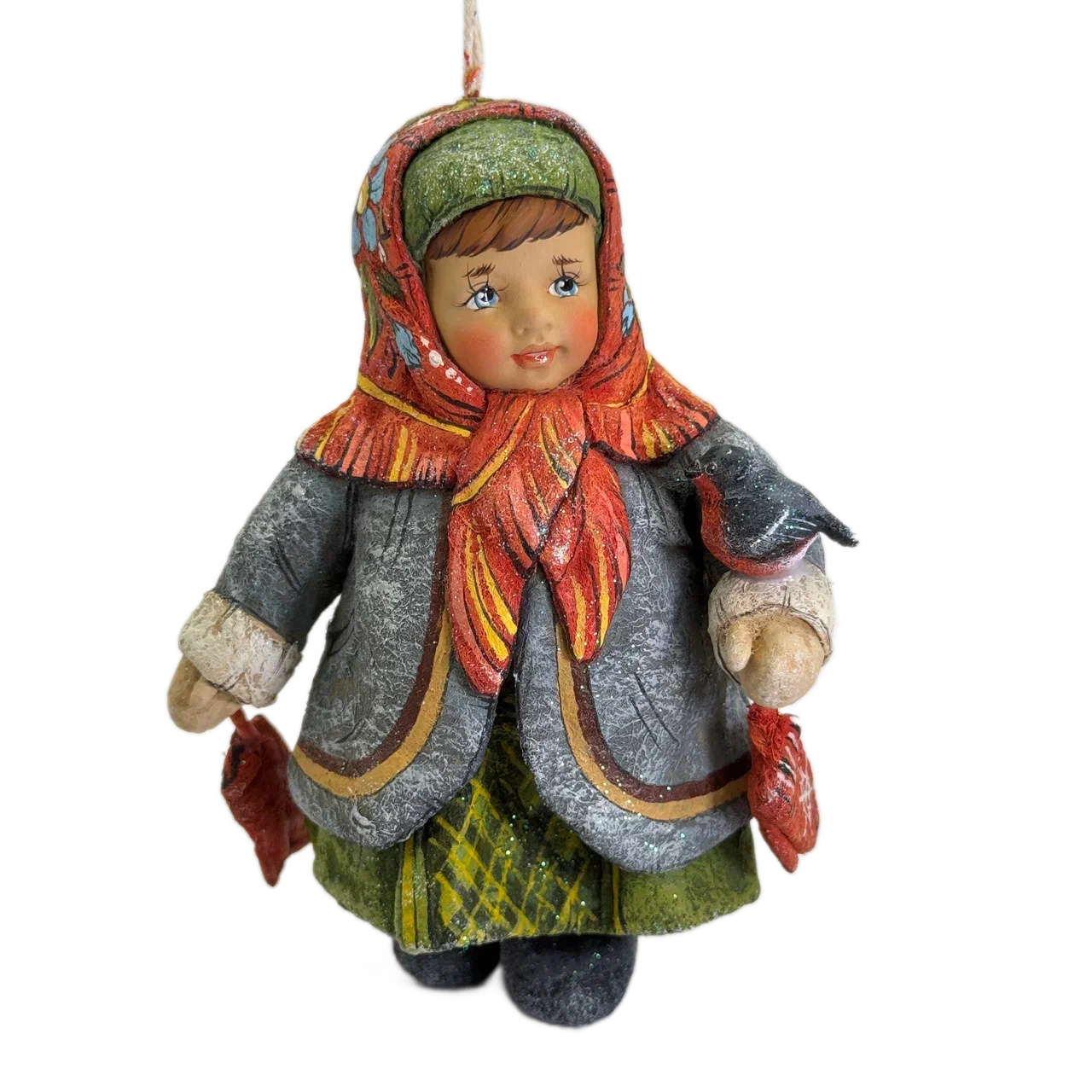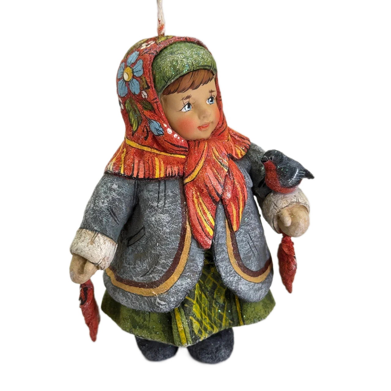 Коллекционная елочная ватная игрушка "Тонечка со снегирем" из коллекции "Русский север"