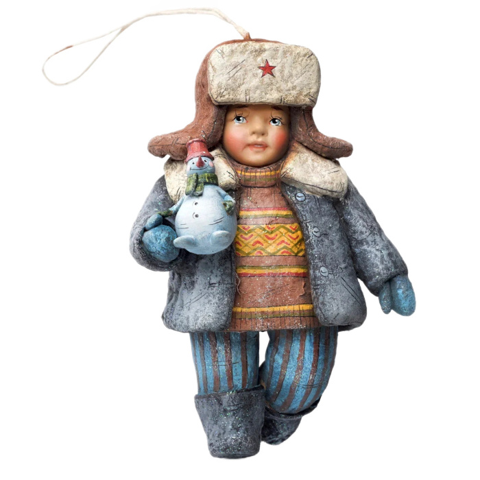 Коллекционная елочная ватная игрушка "Вадюша со снеговичком" из коллекции "Советское детство"