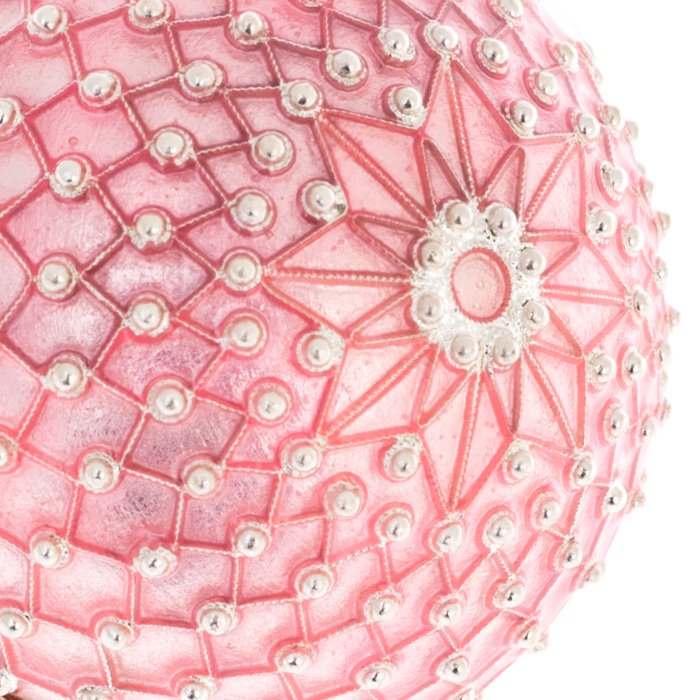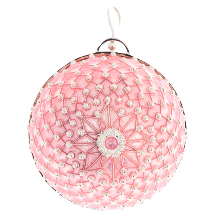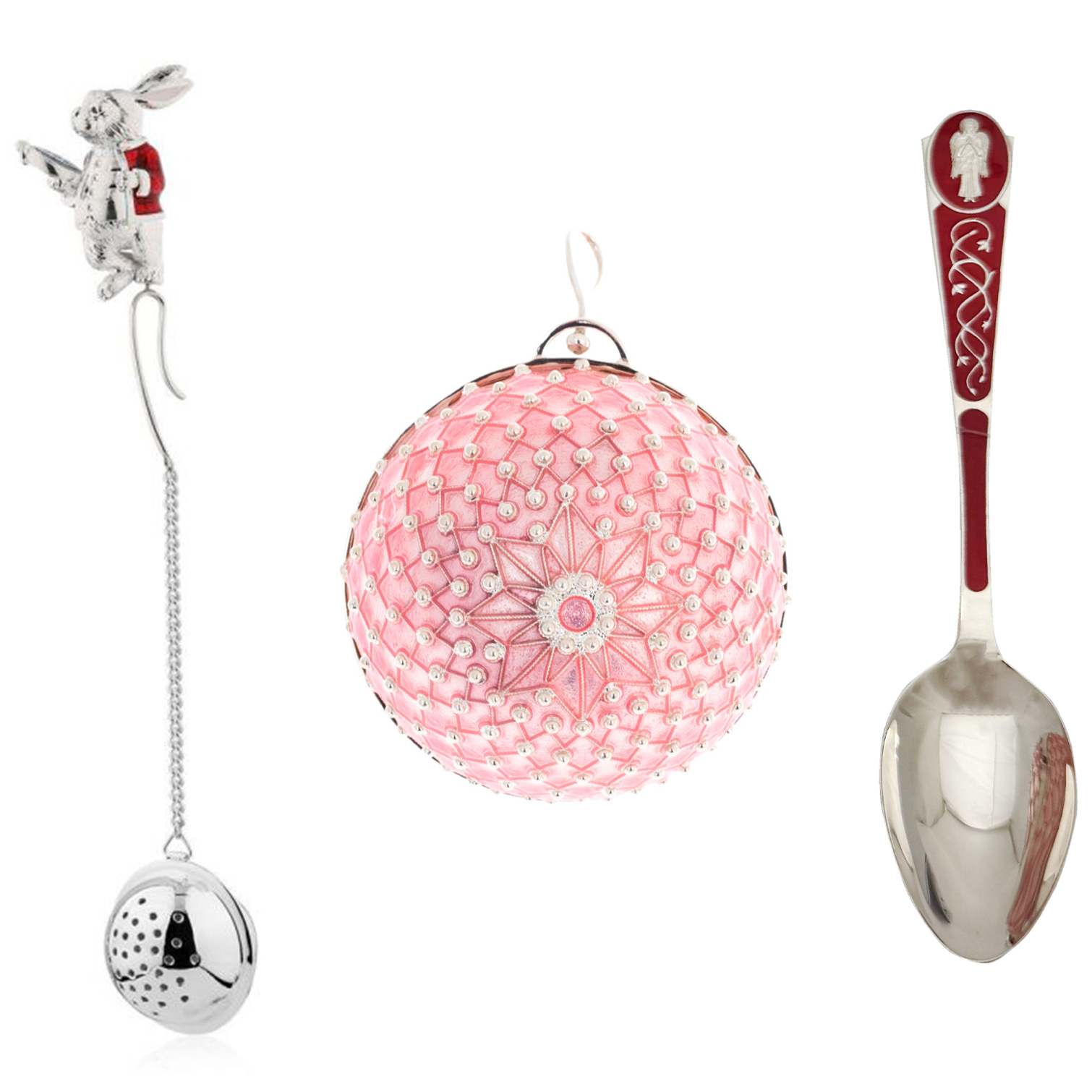 Подарочный новогодний набор «Розовый» представляет собой изящную композицию из трёх предметов, собранных в едином эстетическом ключе. В центре — праздник нежности и света: роскошный рождественский шар, созданный в технике художественной эмали, сияющий оттенками розового жемчуга. Рельефная звезда, раскрывающаяся на его поверхности, вплетена в орнамент из миниатюрных страз, отражающих мягкое свечение, словно крупинки инея на зимнем воздухе. К шару добавлены серебряная ложечка и чайное ситечко, украшенные глубокими алыми эмалями и миниатюрными фигурными деталями, придающими набору характер искреннего, камерного подарка.