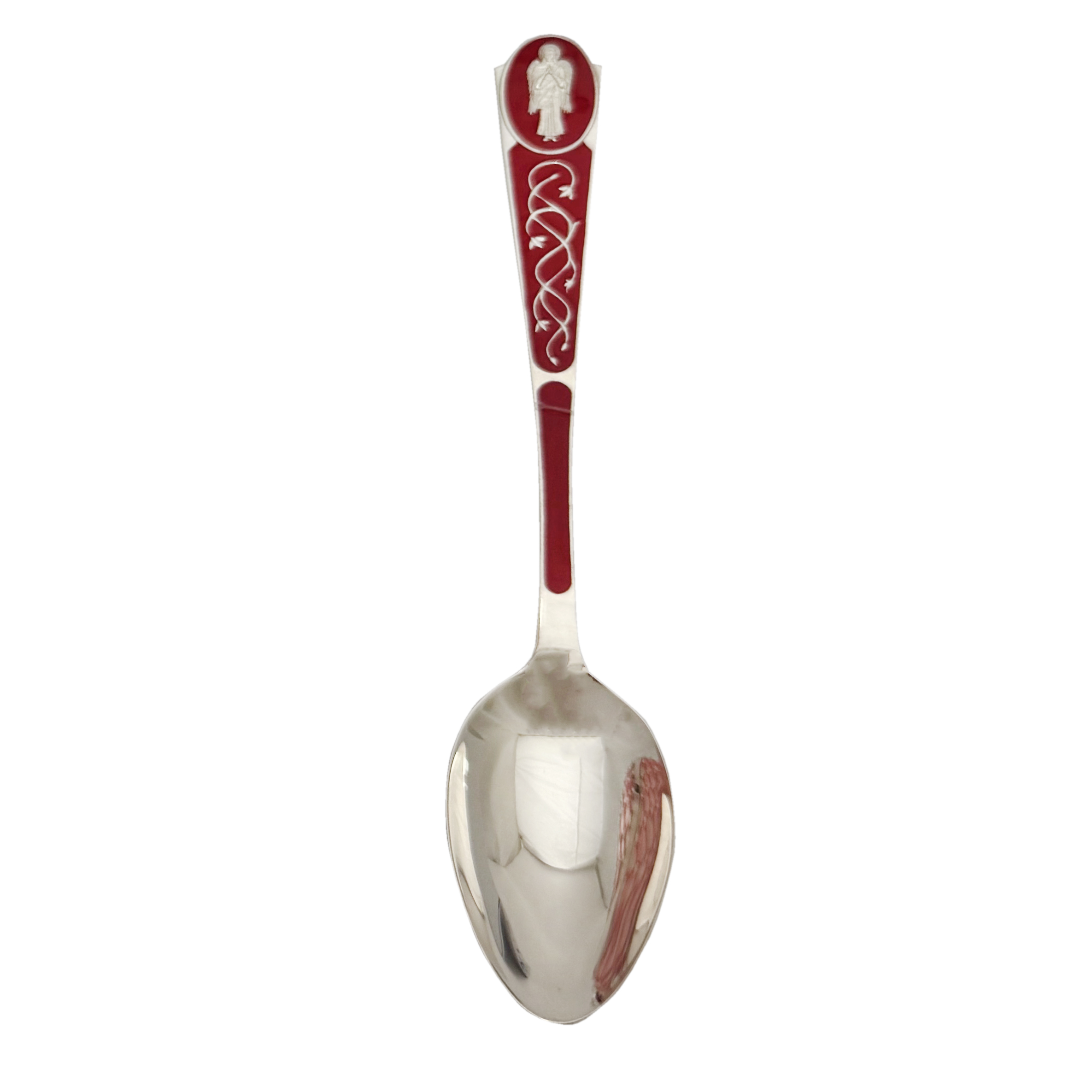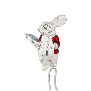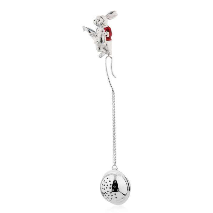 Ситечко, закреплённое на тонкой цепочке, увенчано фигуркой зайца — персонажем, будто сошедшим со страниц старинной сказки. Ложечка, выполненная в том же художественном ансамбле, несёт эмалевые акценты и тонко прописанный рельеф, будто созданный специально для ритуала неспешного зимнего чаепития. Все элементы набора выполнены из ювелирного металла с тщательной полировкой, подчёркивающей каждую грань декоративной работы.