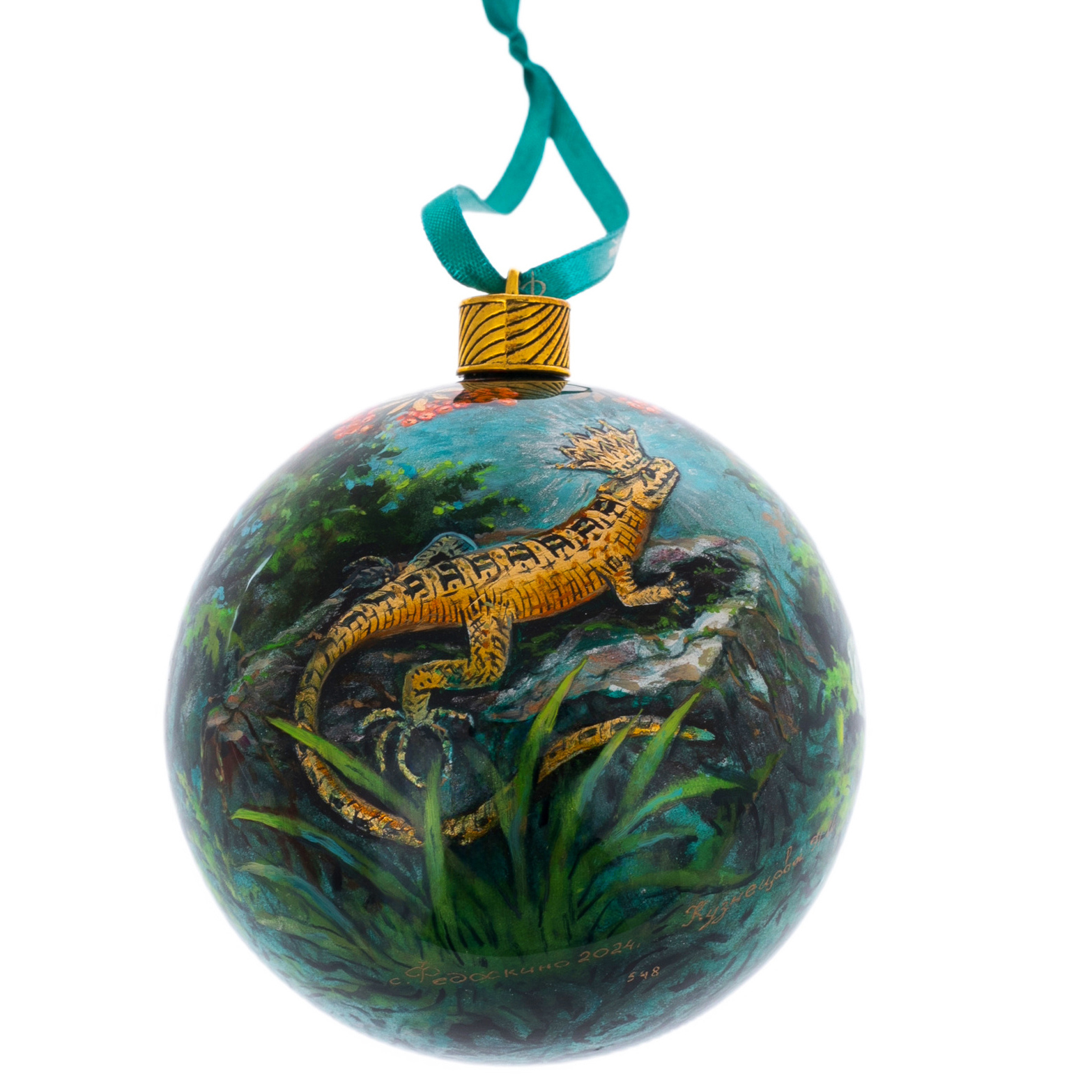 Упакованный в лаконичный футляр из натуральных материалов, этот ёлочный шар становится хранителем семейных сокровищ, воплощая стремление к вечному и прекрасному. "Ящерица в короне" — не просто украшение, а знак избранности, талисман для тех, кто знает цену совершенству и умеет увидеть за линиями и цветами бесконечность возможностей.