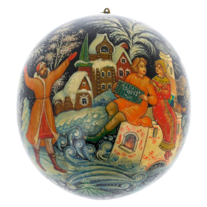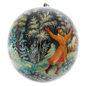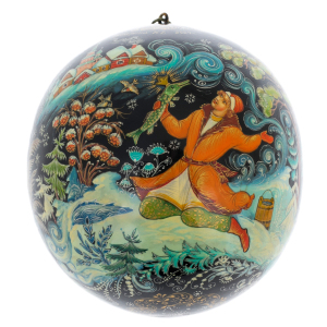 Этот елочный шар создан в традициях палехской миниатюры, прославившейся филигранной прорисовкой деталей и глубокой поэтичностью образов. Ручная роспись ложится на идеальную поверхность шара тонкими, почти ювелирными линиями, придавая ему характер художественного объекта, а не просто праздничного аксессуара. Каждая мазковая тень, каждая золотая нить орнамента вписывается в канон лаковой живописи, формируя впечатление драгоценной миниатюры, перенесенной на объемную сферу.
