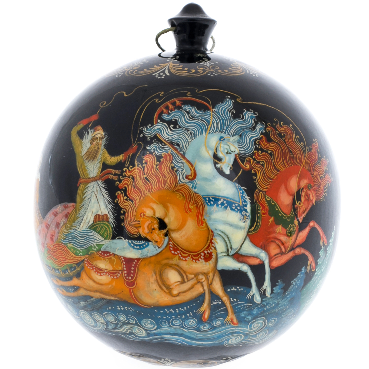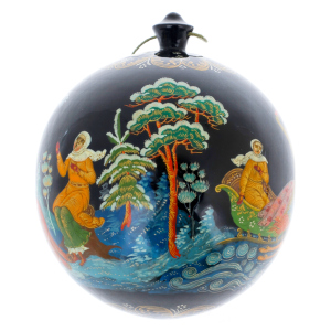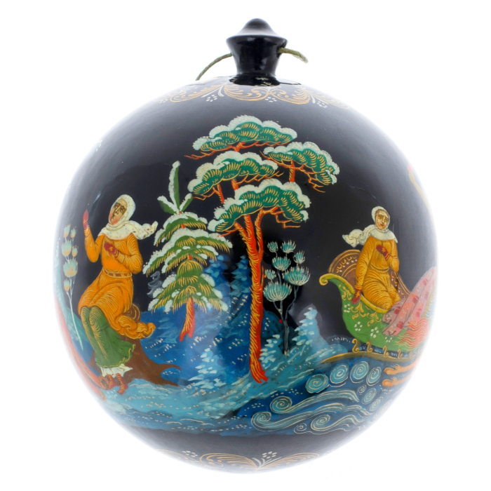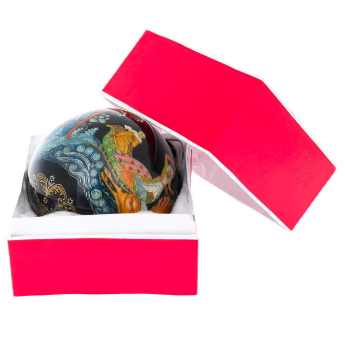 Этот елочный шар создан в традициях палехской миниатюры, прославившейся филигранной прорисовкой деталей и глубокой поэтичностью образов. Ручная роспись ложится на идеальную поверхность шара тонкими, почти ювелирными линиями, придавая ему характер художественного объекта, а не просто праздничного аксессуара. Каждая мазковая тень, каждая золотая нить орнамента вписывается в канон лаковой живописи, формируя впечатление драгоценной миниатюры, перенесенной на объемную сферу.