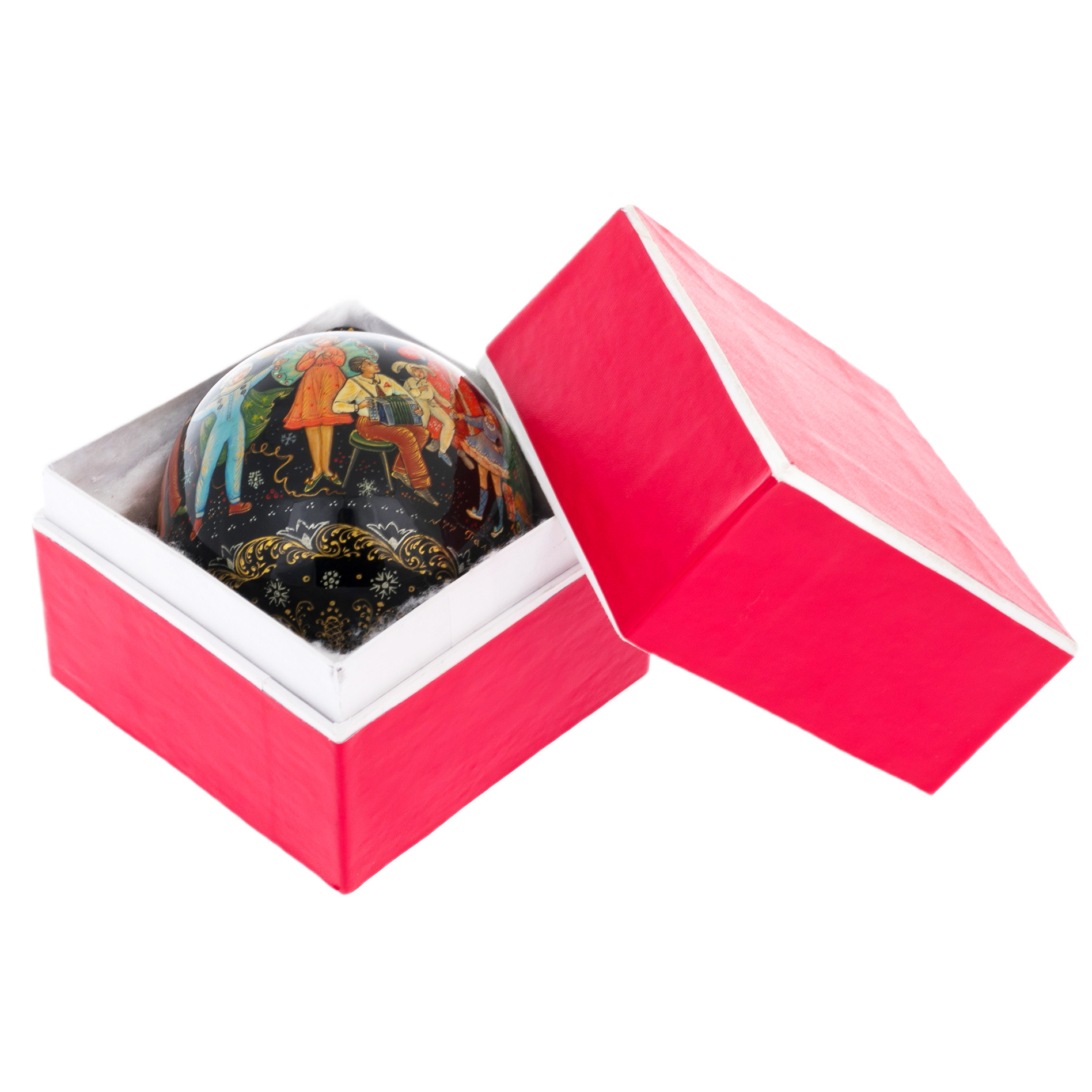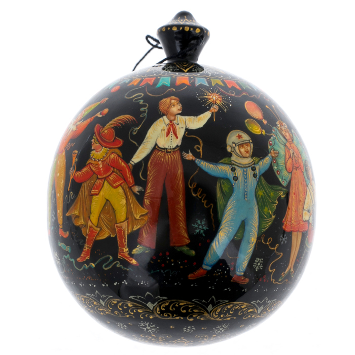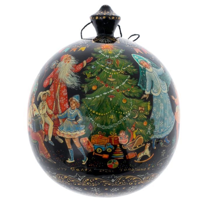 Этот елочный шар создан в традициях палехской миниатюры, прославившейся филигранной прорисовкой деталей и глубокой поэтичностью образов. Ручная роспись ложится на идеальную поверхность шара тонкими, почти ювелирными линиями, придавая ему характер художественного объекта, а не просто праздничного аксессуара. Каждая мазковая тень, каждая золотая нить орнамента вписывается в канон лаковой живописи, формируя впечатление драгоценной миниатюры, перенесенной на объемную сферу.