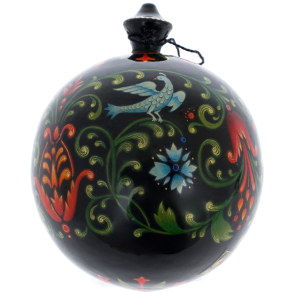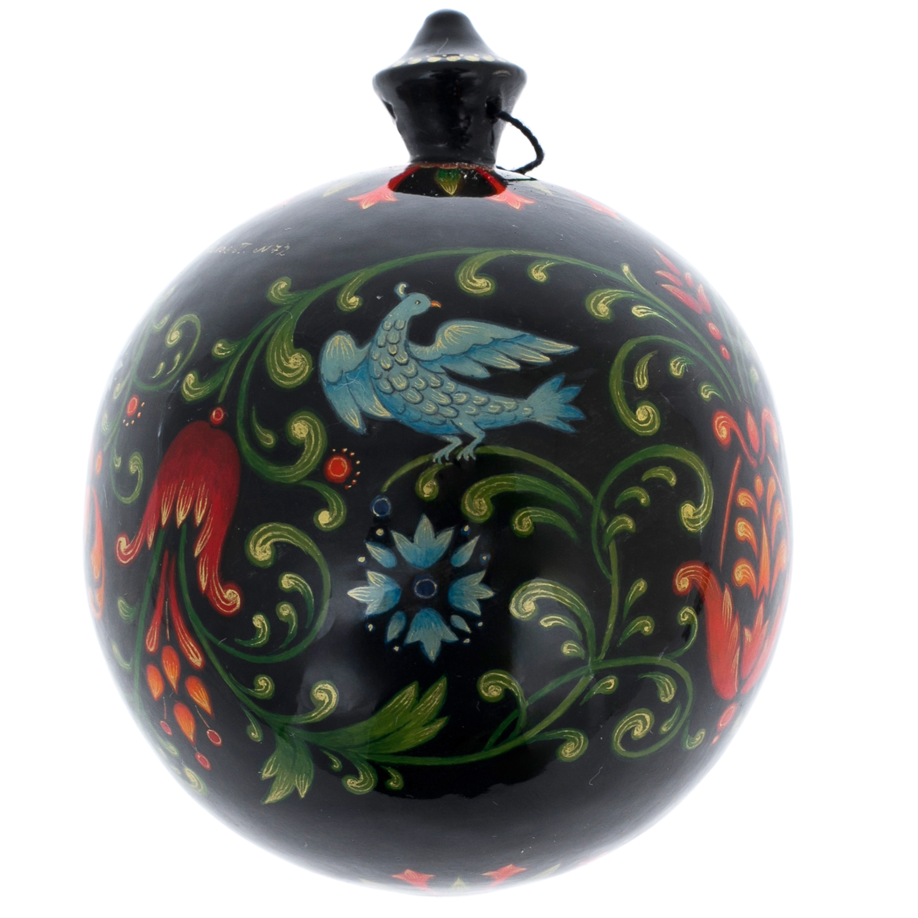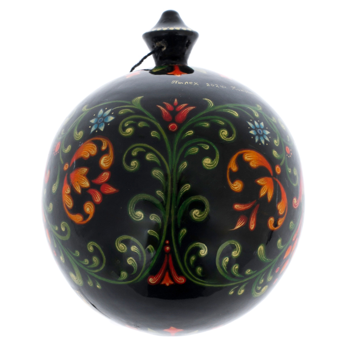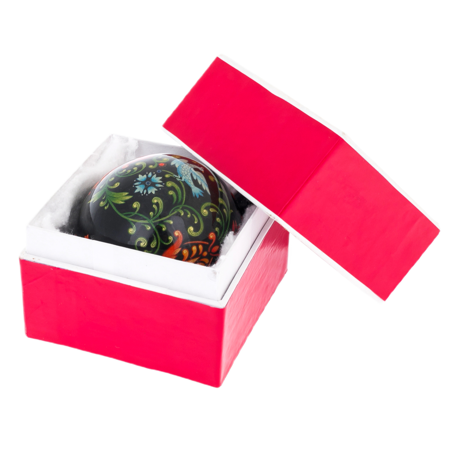 Этот елочный шар создан в традициях палехской миниатюры, прославившейся филигранной прорисовкой деталей и глубокой поэтичностью образов. Ручная роспись ложится на идеальную поверхность шара тонкими, почти ювелирными линиями, придавая ему характер художественного объекта, а не просто праздничного аксессуара. Каждая мазковая тень, каждая золотая нить орнамента вписывается в канон лаковой живописи, формируя впечатление драгоценной миниатюры, перенесенной на объемную сферу.