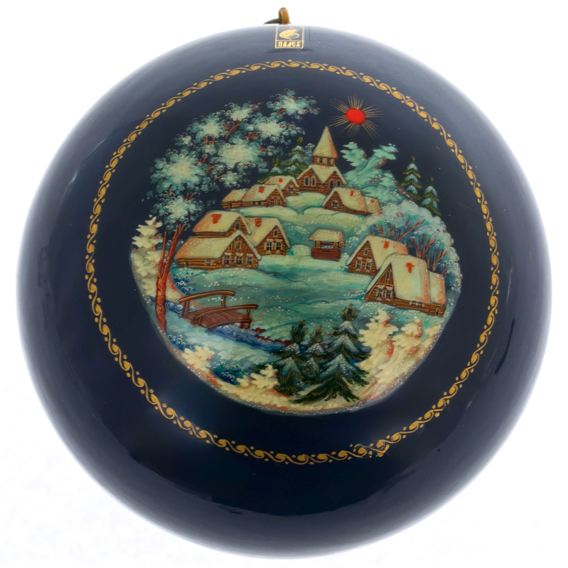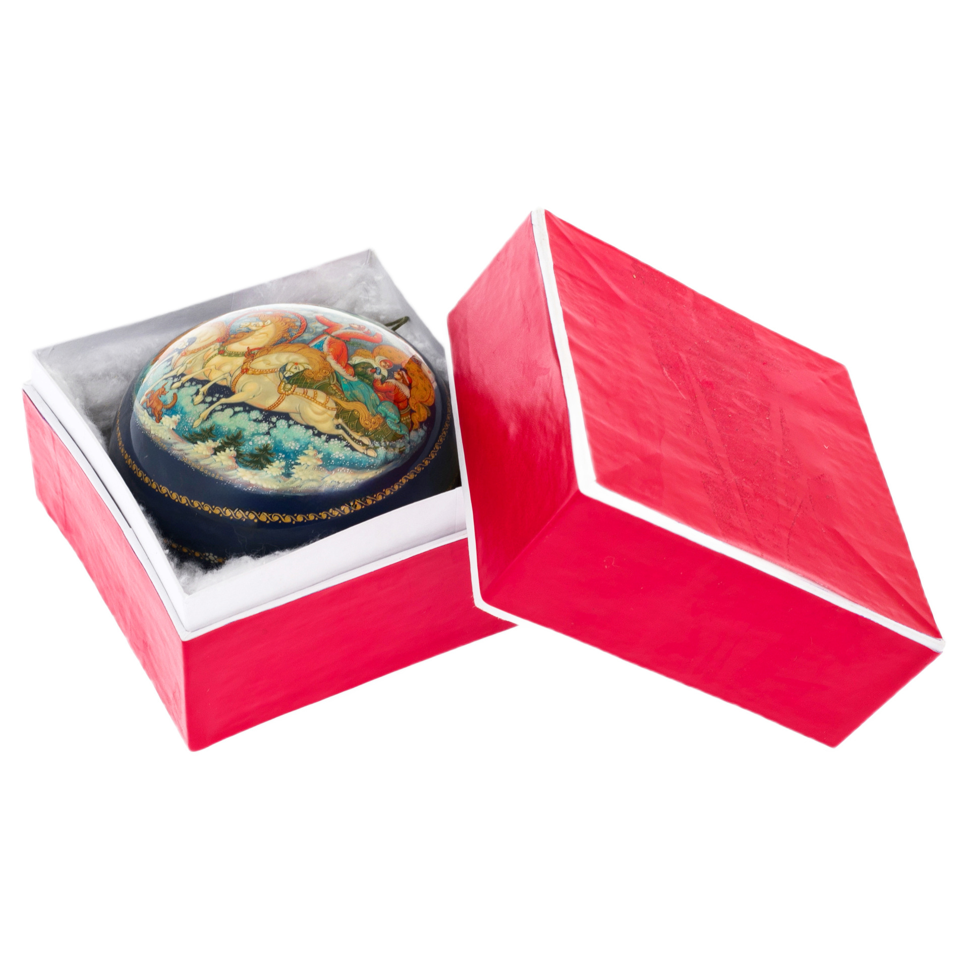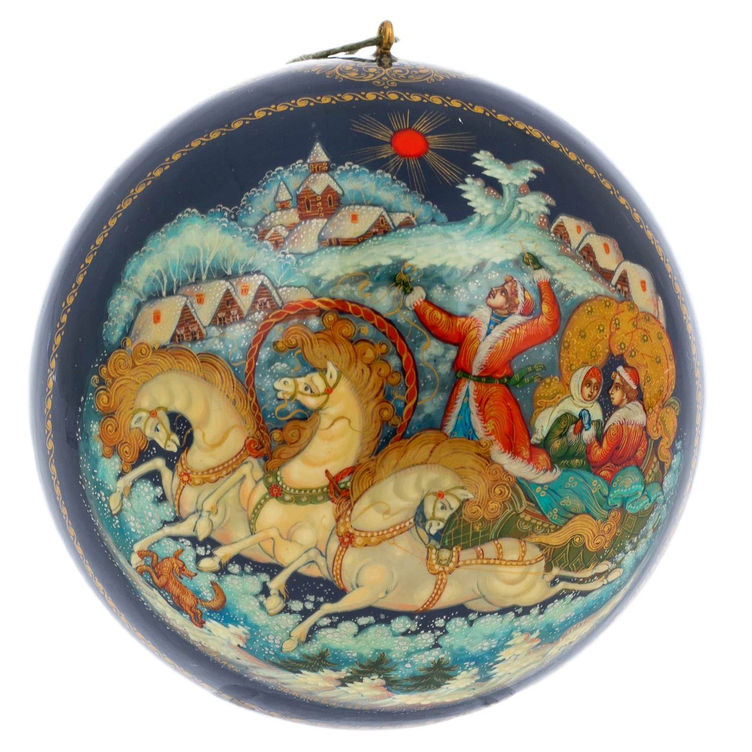 Этот елочный шар создан в традициях палехской миниатюры, прославившейся филигранной прорисовкой деталей и глубокой поэтичностью образов. Ручная роспись ложится на идеальную поверхность шара тонкими, почти ювелирными линиями, придавая ему характер художественного объекта, а не просто праздничного аксессуара. Каждая мазковая тень, каждая золотая нить орнамента вписывается в канон лаковой живописи, формируя впечатление драгоценной миниатюры, перенесенной на объемную сферу.