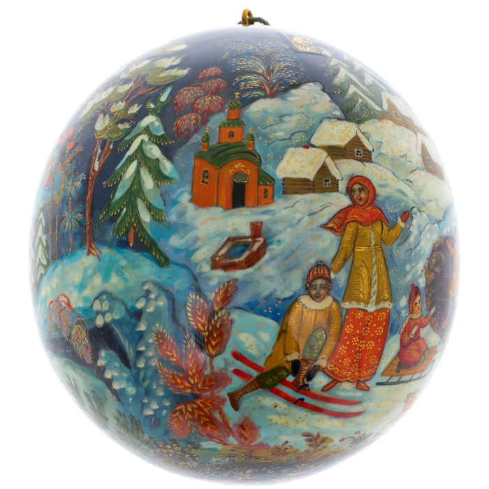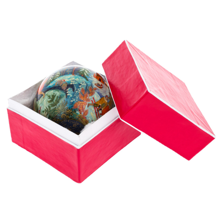 Этот елочный шар создан в традициях палехской миниатюры, прославившейся филигранной прорисовкой деталей и глубокой поэтичностью образов. Ручная роспись ложится на идеальную поверхность шара тонкими, почти ювелирными линиями, придавая ему характер художественного объекта, а не просто праздничного аксессуара. Каждая мазковая тень, каждая золотая нить орнамента вписывается в канон лаковой живописи, формируя впечатление драгоценной миниатюры, перенесенной на объемную сферу.